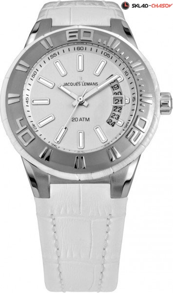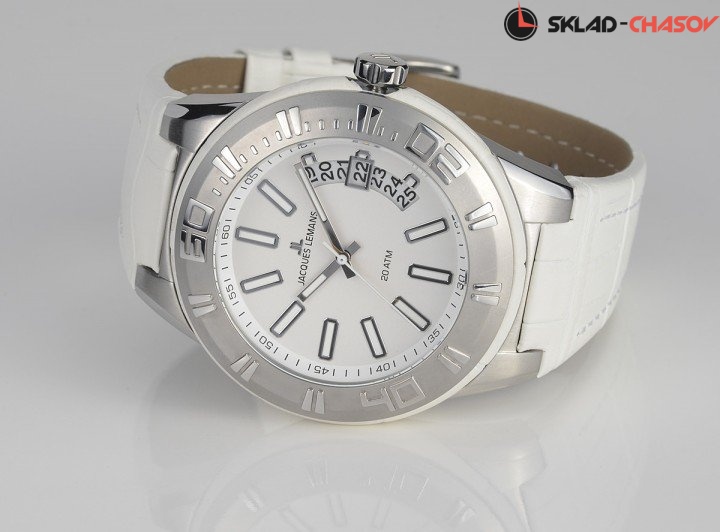 Спортивные часы с кварцевым механизмом из коллекции Miami. Крупный корпус диаметром 50 мм выполнен из прочной нержавеющей стали. Широкий рельефный безель обрамлен кожаным рантом. Белый циферблат вмещает крупные риски и стрелки с люминесцентным покрытием, которое помогает определить время даже в темноте. Необычный индикатор даты подчеркивает яркий и современный дизайн модели. В часах установлено ударопрочное минеральное стекло Crystex. Белый ремешок из натуральной кожи с прошивкой комфортно лежит на запястье благодаря специальным эргономичным вставкам. В модели с повышенной водостойкостью 20 атмосфер можно плавать и заниматься снорклингом. Стильные и функциональные, эти часы станут незаменимым помощником тем, кто ценит активный образ жизни.
