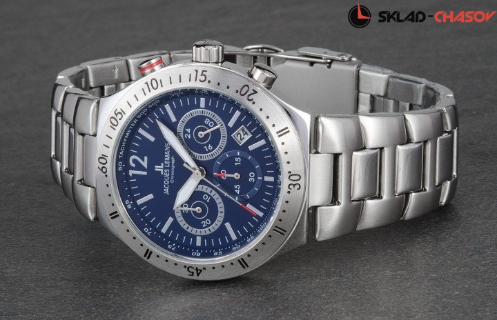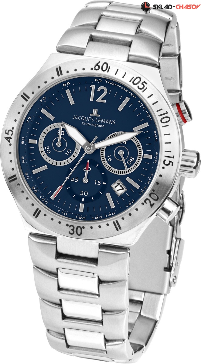 Часы Жак Леман из линейки Dover спортивный многофункциональный хронограф. Корпус и браслет выполнены из высококачественной легированной стали, на безель нанесена дополнительная минутная разметка. Застежка браслета имеет дополнительную защиту от случайного открытия. На циферблате расположены риски, арабская цифра 12 часов и крупные люминесцентные стрелки, которые ярко светятся в темноте. В ранте вынесена тахиметрическая шкала, для определения скорости. Часы оснащены хронографом, а окно даты расположено между 4 и 5 часами. Кварцевый механизм обеспечивает точность хода, минеральное стекло усилено напылением Crystex. Герметичность 10 АТМ гарантирует надежную защиту от воды. Часы Жак Леман с максимальным набором функций отлично подойдут спортсменам и людям ведущих активный образ жизни.