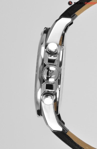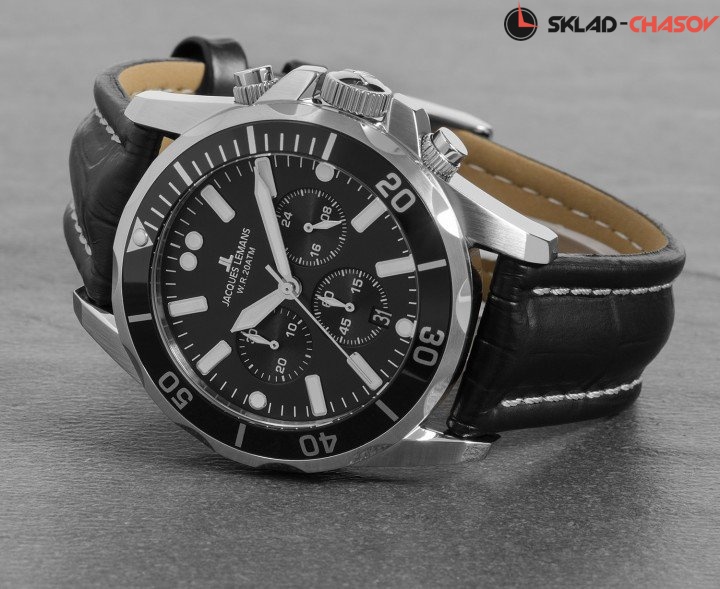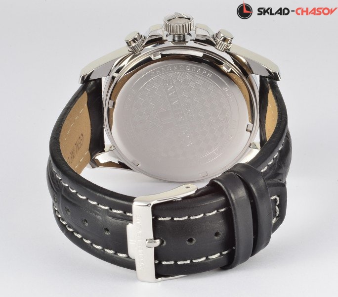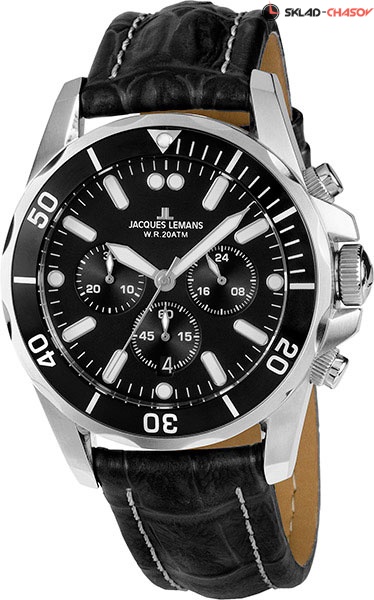 Впечатляющий спортивный хронограф из серии Liverpool Diver. Корпус диаметром 43 мм сделан из прочной нержавеющей стали, его дополняет широкий вращающийся безель. На циферблате черного цвета привлекают внимание крупные риски, а так же — дополнительные индикаторы 24-х часов, минутного, секундного накопителей и даты. Рельефные кнопки хронографа удобны в использовании. В кварцевой модели установлено ударопрочное минеральное стекло Crystex. Завинчивающиеся заводная головка и задняя крышка поддерживают повышенную водостойкость в 20 атмосфер. Плотный черный ремешок из натуральной кожи смотрится эффектно, благодаря контрастной прошивке. Эти часы воплощают все лучшее в спортивном дизайне. Они созданы для тех, кто ценит качество, практичность и высокую функциональность.