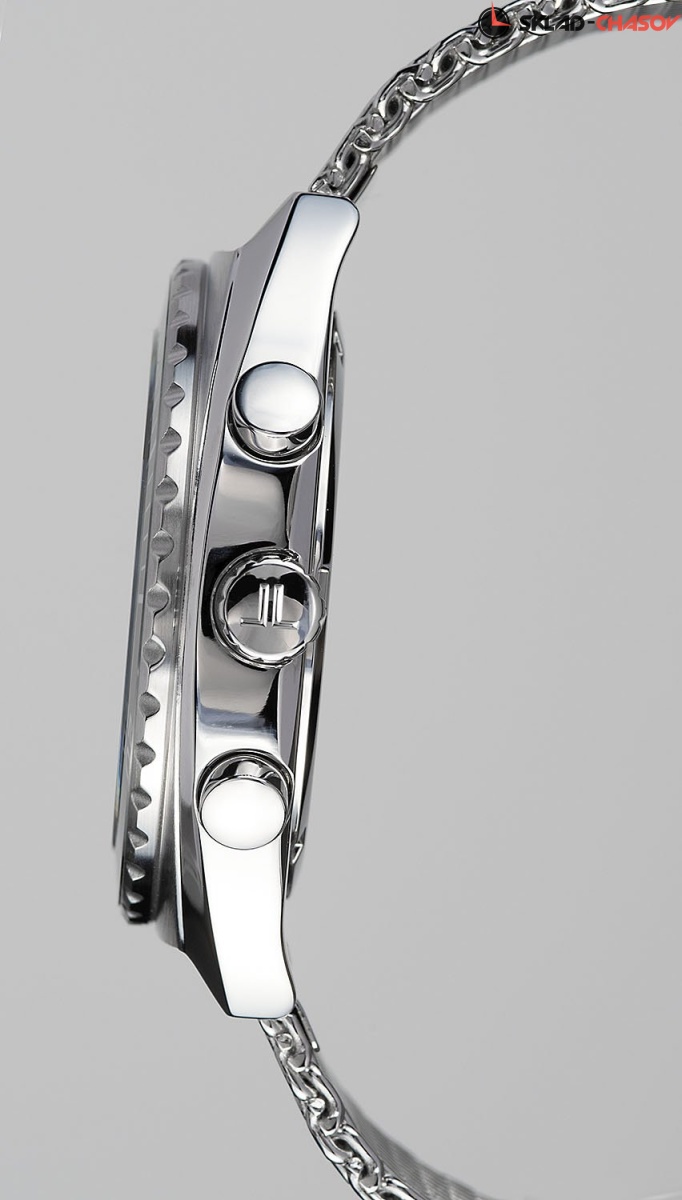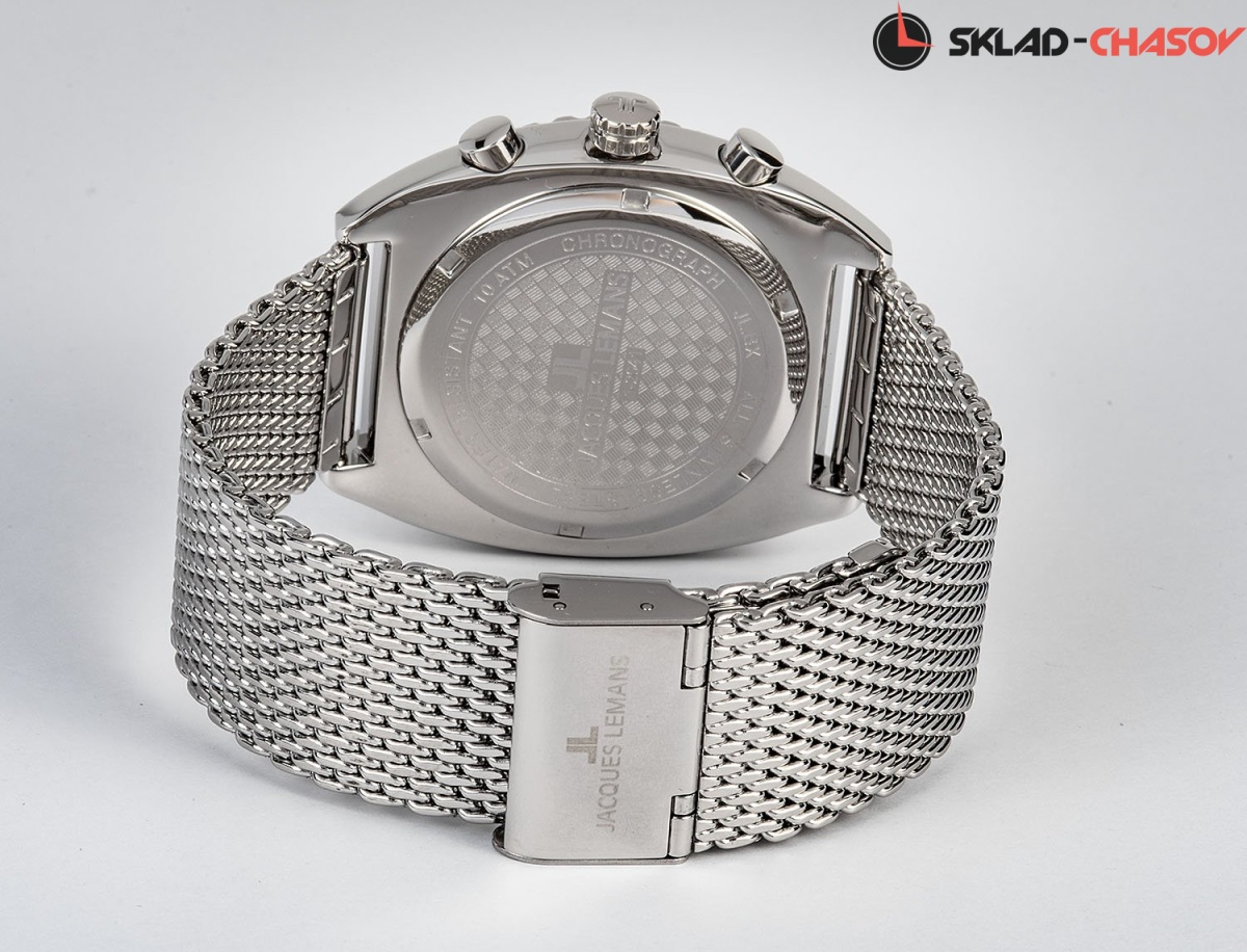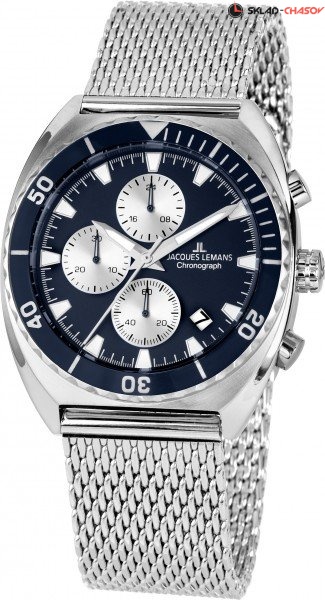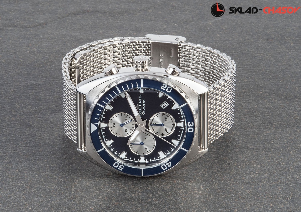 Необычная модель серии Retro от Jacques Lemans. Корпус из цельной нержавеющей стали с диаметром 41 мм обрамляет циферблат синего цвета. На нем находятся дополнительные индикаторы хронографа, выделенные полировкой. Окошко даты в позиции между 4 и 5 часами. В этих кварцевых часах установлено ударопрочное минеральное стекло Crystex. Задняя крышка с резьбой обеспечивает водостойкость 10 атмосфер. Стальной браслет миланского плетения снабжен специальной застежкой, которая позволяет самостоятельно регулировать его длину. Запоминающиеся спортивный хронограф, выполненный в стиле «ретро».