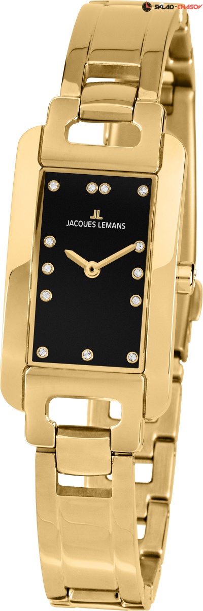 Элегантные кварцевые часы установлены в полированный корпус прямоугольной формы из нержавеющей стали с покрытием из желтого золота. Черный лаконичный циферблат украшает блеск кристаллов знаменитого бренда Swarovski. Хорошо читаются часовая и минутная стрелки. Ударопрочное минеральное стекло Crystex надежно защищает циферблат от внешних воздействий. На стальной браслет с оригинальными звеньями установлена удобная в использовании застежка–клипса. Этот изящный аксессуар дополнит гардероб самой требовательной модницы. Часы Jacques Lemans будут уместным украшением как на деловой встрече, так и во время торжественного выхода в свет.