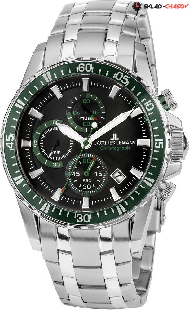 Стильный мужской хронограф Jacques Lemans создан для тех, кто предпочитает активный образ жизни. Присутствует апертура текущей даты. На стрелки и часовые метки нанесен светонакопительный состав для возможности считывания времени в темноте. Циферблат закрывает минеральное стекло Crystex повышенной прочности. Заводная головка с защитой. Завинчивающаяся задняя крышка.