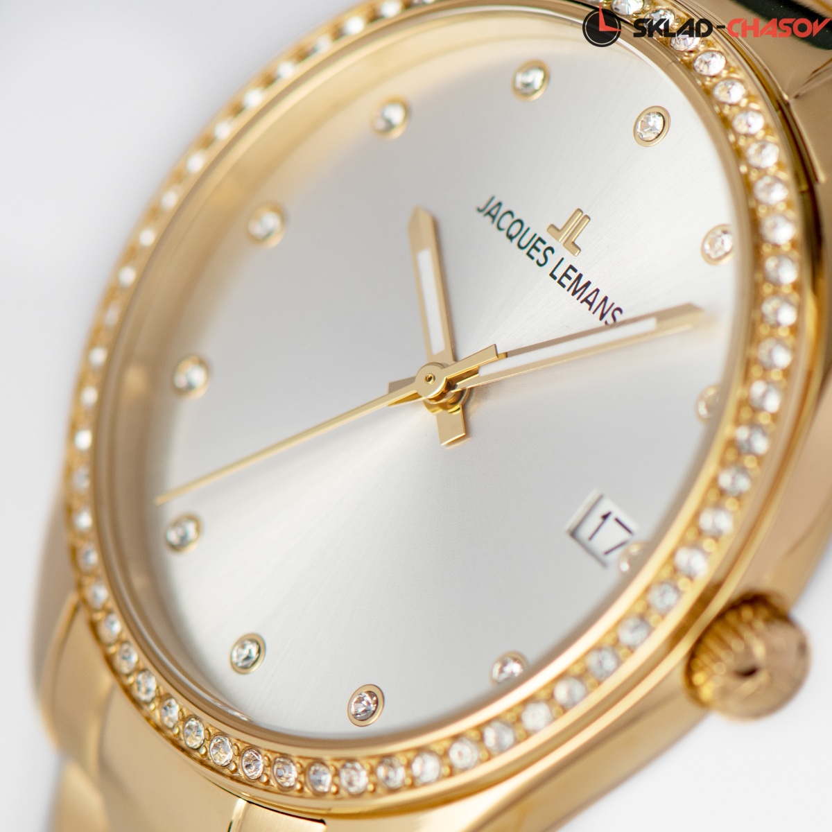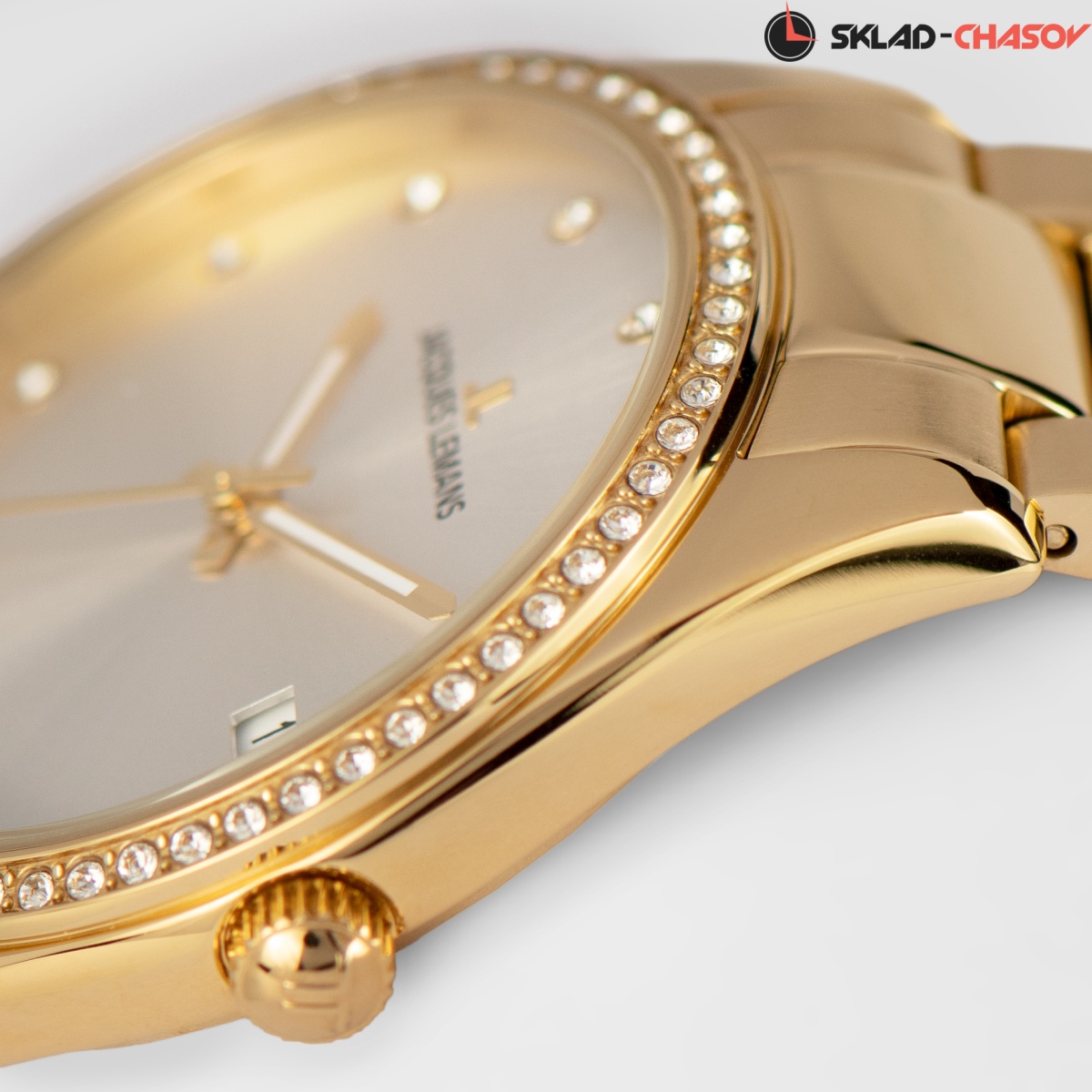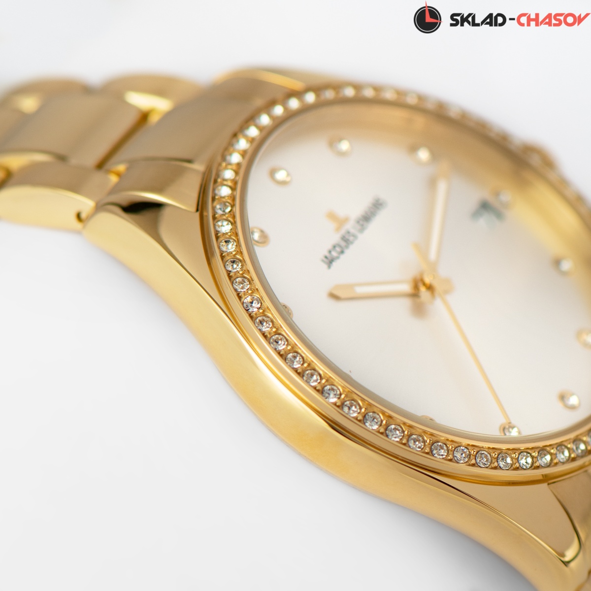 Кварцевая модель из коллекции Derby очаровывает своей лаконичностью. Корпус из прочной нержавеющей стали с PVD-покрытием из желтого золота имеет диаметр 34 мм. Он обрамляет стальной циферблат с полировкой в виде солнечных лучей. Циферблат, как и тонкий безель, украшены кристаллами Swarovski. Удобный индикатор даты размещен в позиции «3 часа». В модели установлено ударопрочное минеральное стекло Crystex. Повышенная водонепроницаемость равна 10 атмосфер. Браслет собран из стальных звеньев с надежной застежкой — клипсой, оснащенной дополнительной защитой от случайного расстегивания. Эти часы — идеальный аксессуар, который будет уместен практически в любой ситуации, для любого выхода.