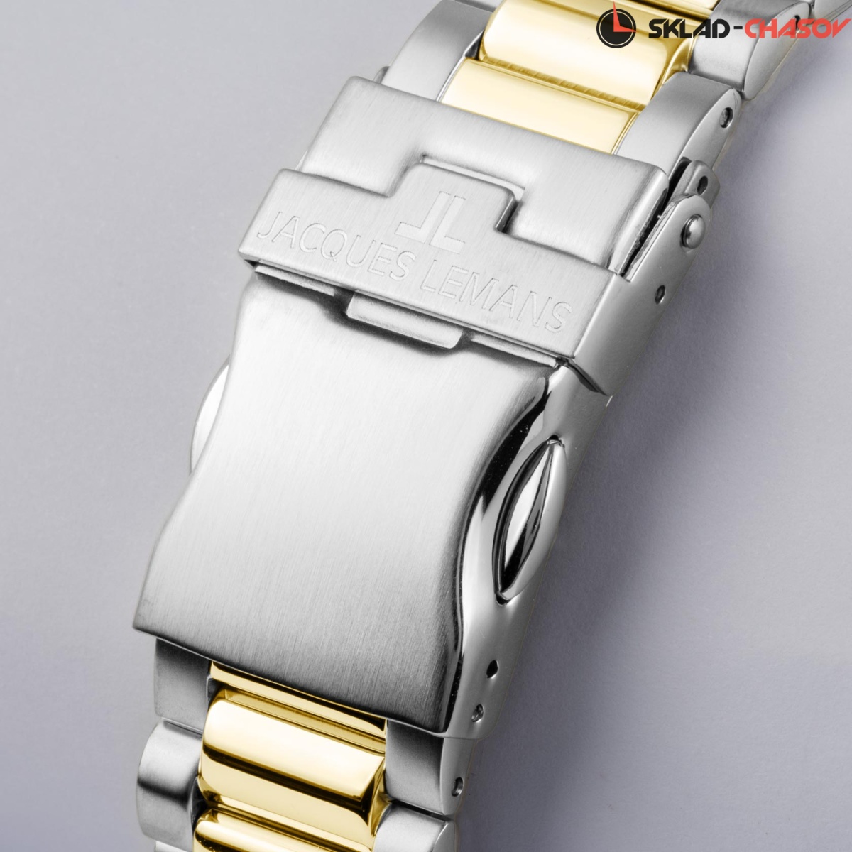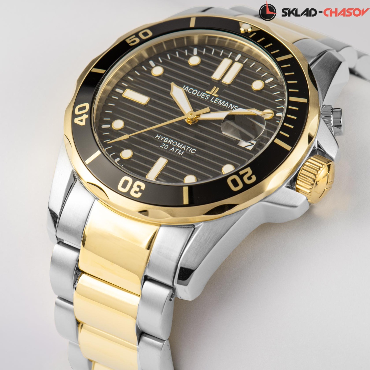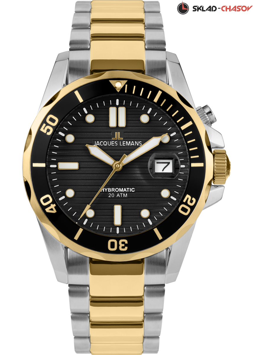Революционные механические часы: запас хода держится до 180 дней (при полном заводе). Инновационная технология этой модели сочетает в себе функциональность автоматических часов с точностью кварцевых. Особенность Jacques Lemans Hybromatic состоит в том, что энергия для работы часов производится самостоятельно при отсутствии зависимости от элемента питания. Естественные движения руки проводят в движение маховик, генерирующий электрическую энергию, которая используется для запуска часов. Гибридный механизм установлен в корпус диаметром 41 мм из нержавеющей стали с эффектным широким безелем, на который вынесена дополнительная индикация. На черном циферблате хорошо читаются крупные стрелки и риски. Они выделены люминесцентным покрытием, которое светится в темноте, помогая определить время в любых условиях видимости. Окошко даты расположено в позиции «3 часа». В модели установлено ударопрочное минеральное стекло Crystex. Прозрачная задняя крышка позволит в подробностях разглядеть необычный механизм. Повышенная водостойкость 20 атмосфер. Браслет сделан из стали с надежной застежкой-клипсой. Новые часы от Jacques Lemans – идеальный аксессуар на каждый день: универсальный дизайн и возможность завода механизма при естественных движениях руки владельца.