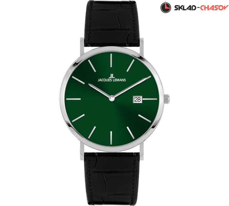 Лаконичные часы выполняют сразу две важные функции: точно показывают время и дату, а также, помогают сделать ваш повседневный образ более стильным и завершенным. Корпус диаметром 38 мм изготовлен из нержавеющей стали, на тонком безеле — зеркальная полировка. Зеленый циферблат с крупными рисками защищен ударопрочным минеральным стеклом с сапфировым напылением. На ремешок из натуральной кожи черного цвета установлена стальная застежка-пряжка с логотипом бренда Jacques Lemans