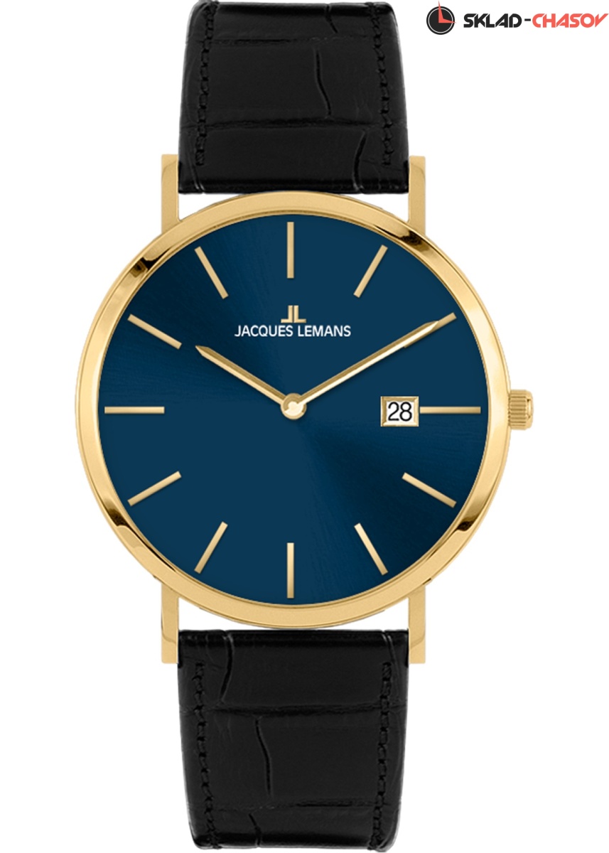 Тонкий корпус кварцевых часов из нержавеющей стали с PVD-покрытием из желтого золота выполнен в стиле минимализм. Безель с зеркальной полировкой обрамляет синий циферблат с контрастными рисками и стрелками. В позиции "3 часа" находится окошко даты, выделенное накладной рамкой. Стильный аксессуар на ремешке из натуральной кожи черного цвета хорошо впишется в повседневный образ. Универсальный диаметр корпуса, равный 38 мм, подойдет как для мужского, так и для женского запястья.