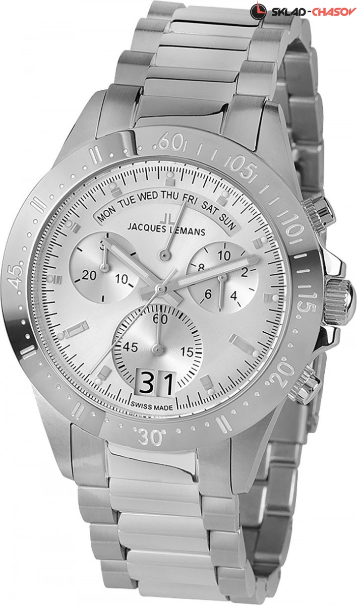 Лимитированная модель часов юбилейной серии Jacques Lemans, выпущенная в количестве 555 экземпляров. Корпус диаметром 44 мм сделан из прочной нержавеющей стали. На широкий безель вынесена дополнительная индикация. Стальной циферблат вмещает окошко большой даты в позиции «6 часов» и необычный ретроградный индикатор дня недели. Полированные индикаторы хронографа показывают 30-минутный накопитель, счетчик 1/10 секунд и вынесенную секундную стрелку. В кварцевых часах установлены ударопрочное минеральное стекло Crystex и завинчивающаяся задняя крышка. Водонепроницаемость равна 10 атмосфер. Стальной браслет из литых звеньев завершает раскладывающаяся застежка-клипса. Великолепные часы высокого качества, способные притягивать взгляды.