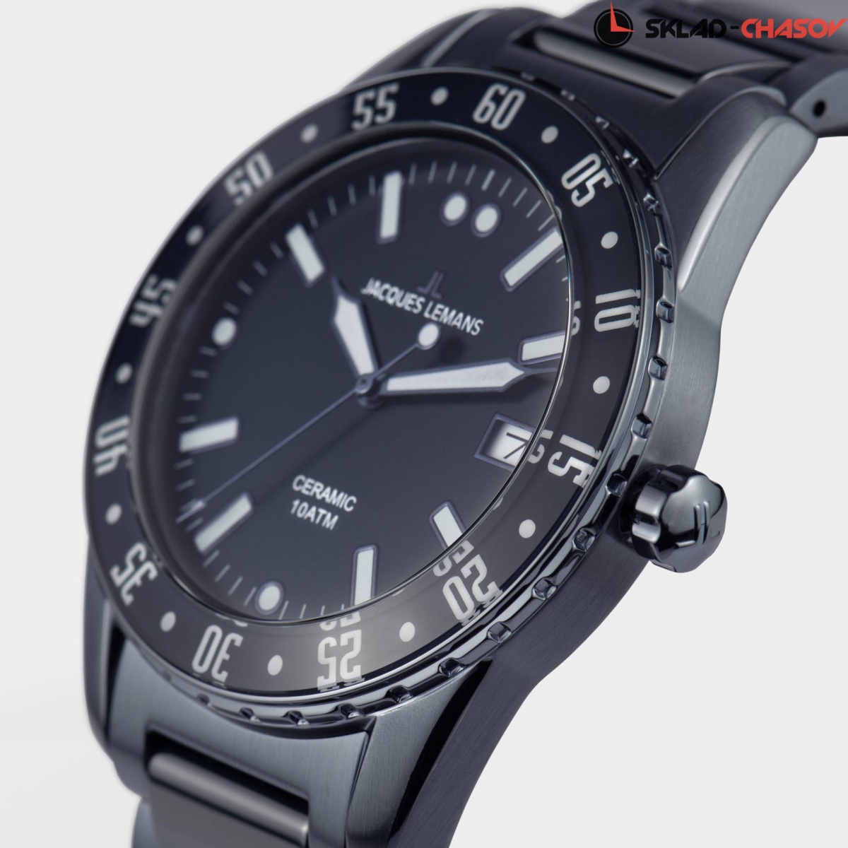 Мужские кварцевые часы Jacques Lemans. Корпус выполнен из стали, браслет выполнен из стали и керамики. Стекло минеральной Crystex. Размер корпуса 42 мм. Водозащита 10 АТМ.