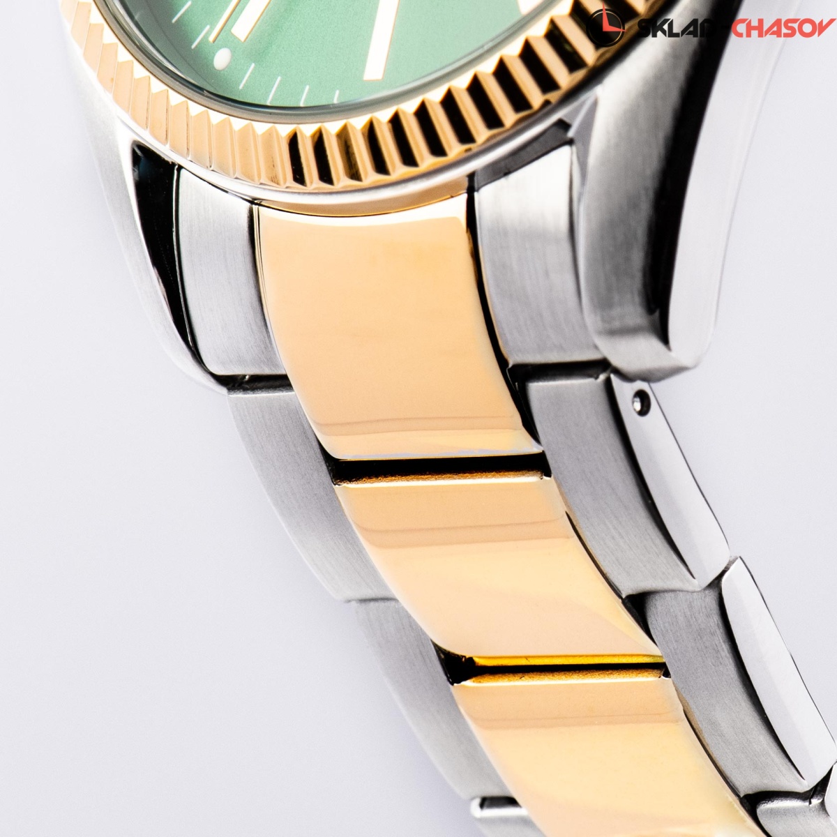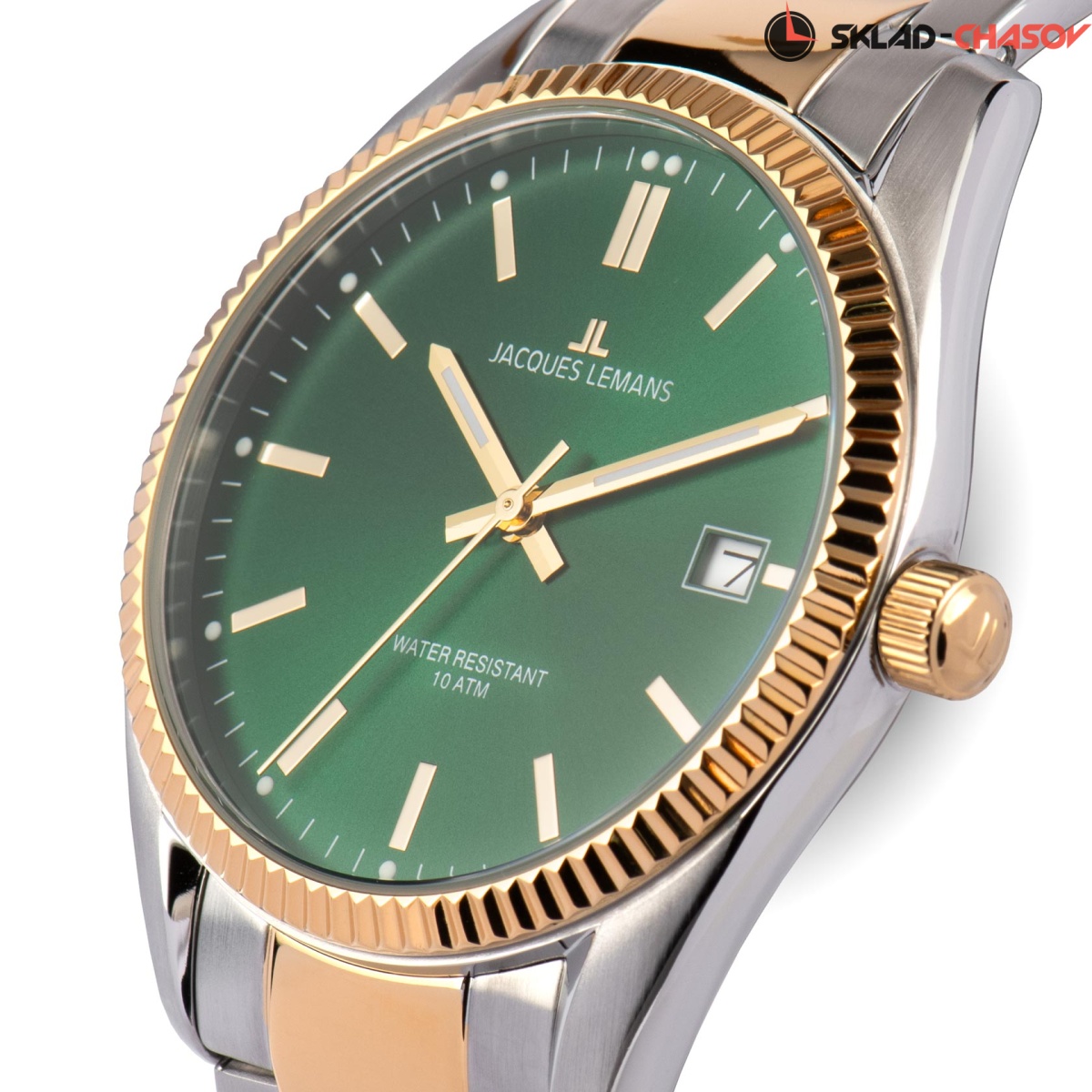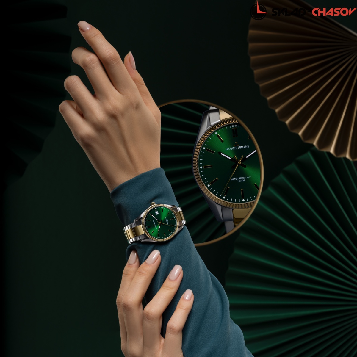 Знаковая серия часов 50-4 была выпущена в честь 50-летнего юбилея со дня основания компании Jacques Lemans. Одно из главных украшений корпуса из нержавеющей стали – ребристый безель с полировкой и PVD-покрытием из желтого золота. Он обрамляет широкий зеленый циферблат с полировкой в виде солнечных лучей и с хорошо читаемыми стрелками и рисками, которые дополнительно выделены люминесцентным покрытием. Окошко даты расположилось на трех часах. Корпус достаточно тонкий, с эргономичными ушками, его диаметр равен 34 мм. Повышенная водостойкость составляет 10 атмосфер. Браслет из нержавеющей стали завершает удобная застежка-клипса с двумя боковыми кнопками и дополнительной защитой. Модель серии 50-4 – не только стильный аксессуар, но и отражение 50-летнего успешного опыта компании Jacques Lemans в создании часов.