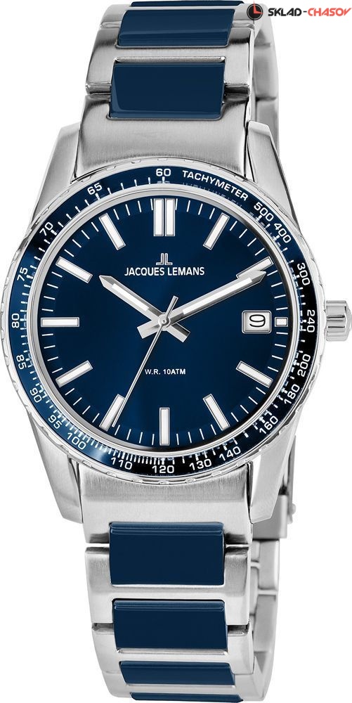 Мужские наручные часы Jacques Lemans на стальном браслете. На безеле размечена тахиметрическая шкала. Присутствует апертура текущей даты. На стрелки и часовые метки нанесен светонакопительный состав для возможности считывания времени в темноте. Циферблат закрывает минеральное стекло повышенной прочности Crystex. Браслет с раскладывающейся застежкой. Гарантия 2 года.