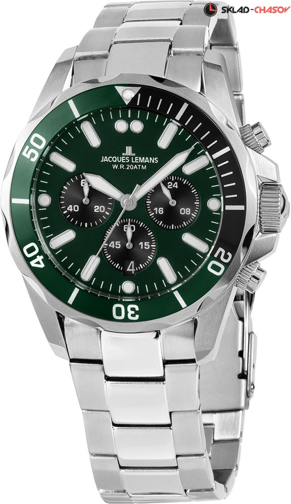 Спортивный мужской хронограф с повышенной водозащитой в 20 атм. На отдельном циферблате отображается текущее время в 24-х часовом формате. На стрелки и часовые метки нанесен светонакопительный состав для возможности считывания времени в темноте. Циферблат закрывает минеральное стекло Crystex повышенной прочности. Широкий вращающийся безель. Завинчивающиеся заводная головка с защитой. Завинчивающаяся задняя крышка. Браслет с раскладывающейся застежкой. Гарантия 2 года.