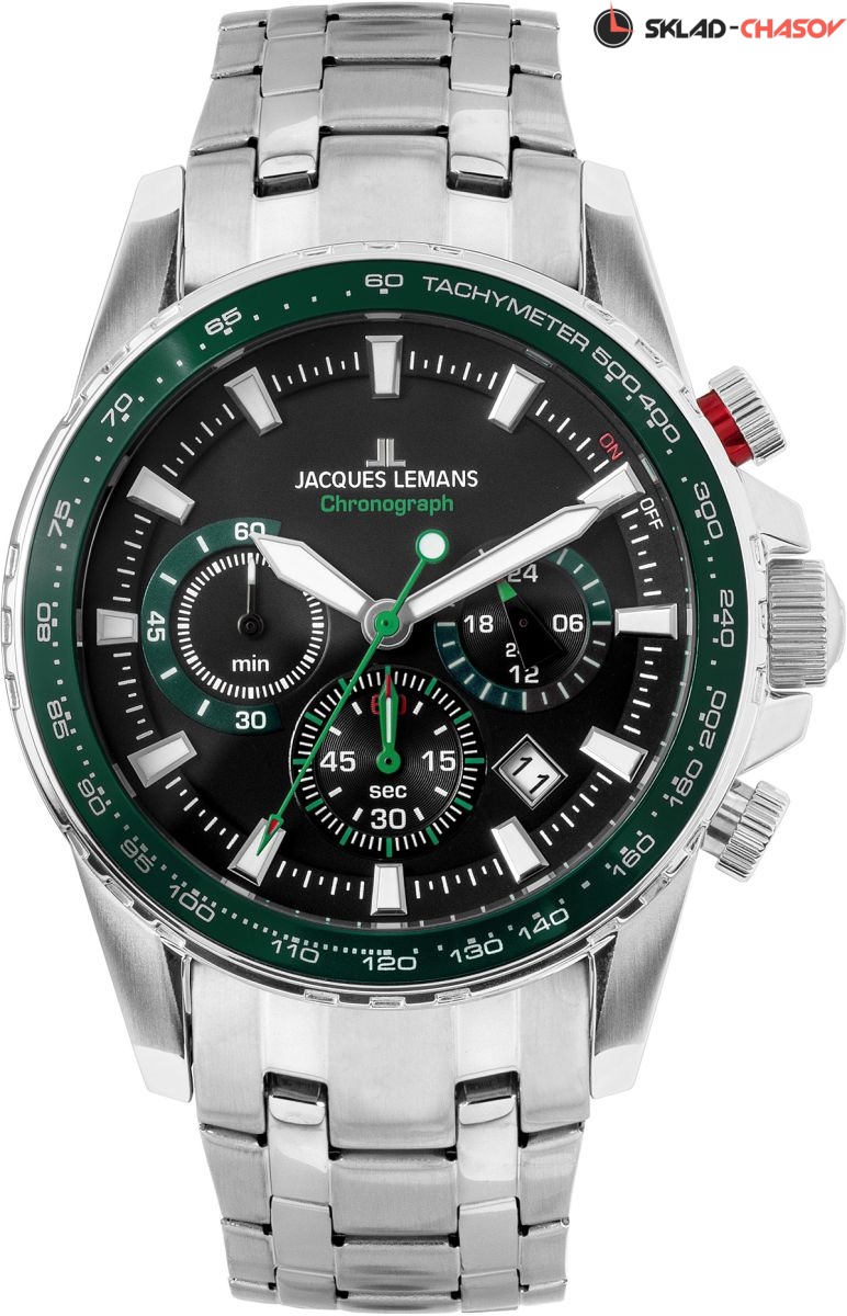 Мужское наручные часы-хронограф Jacques Lemans в круглом стальном корпусе. На отдельном циферблате отображается текущее время в 24-х часовом формате. Присутствует апертура текущей даты. На стрелки и часовые метки нанесен светонакопительный состав для возможности считывания времени в темноте. Циферблат закрывает минеральное стекло Crystex повышенной прочности. На безель нанесена тахиметрическая шкала. Заводная головка с защитой. Браслет с раскладывающейся застежкой. Гарантия 2 года.