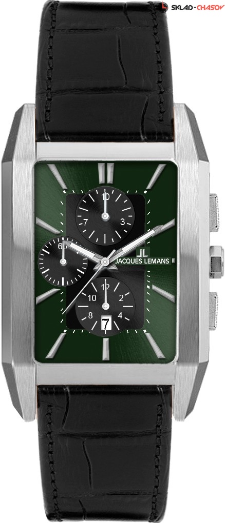 Кварцевый механизм хронографа 1-2161 установлен в стильный прямоугольный корпус из нержавеющей стали. Благодаря эргономичным ушкам часы удобно ложатся на запястье. На темно-зеленом циферблате расположены крупные риски и центральные стрелки, часовая и минутная выделены люминесцентным покрытием. Дополнительные индикаторы позволяют засекать время в часах, минутах, секундах. Окошко даты разместили на 6 часах. Корпус модели дополняет минеральное стекло с сапфировым напылением. Ремешок сделан из натуральной кожи черного цвета с прошивкой. Элегантные часы 1-2161 выигрышно дополнят любой образ, а полезные функции хронографа всегда будут под рукой.