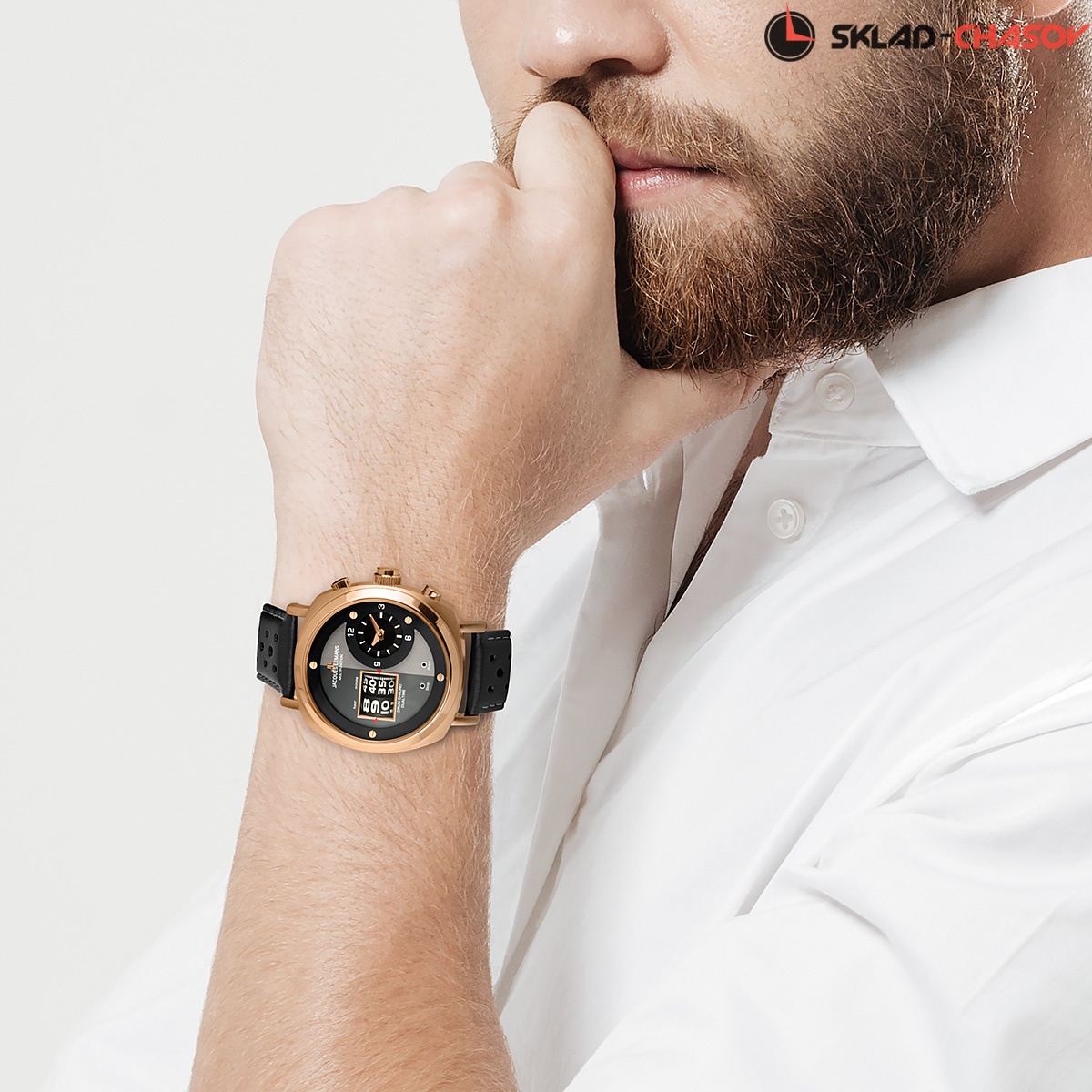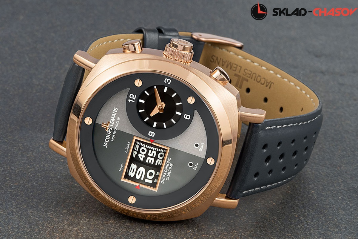 Мужские наручные часы с впечатляющим дизайном. Помимо привычного аналогового дисплея на объемном циферблате часов расположен барабанный роллер для отображения второго часового пояса и показаний хронографа. В нижней части циферблата предусмотрены два световых индикатора работы секундомера. Циферблат закрывает минеральное стекло Crystex повышенной прочности. Перфорированный кожаный ремешок с классической застежкой. Гарантия 2 года.
