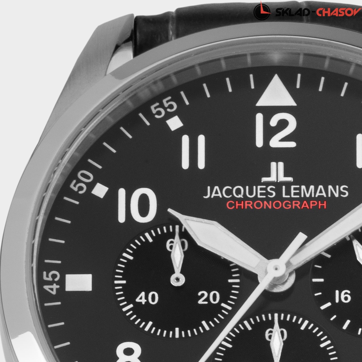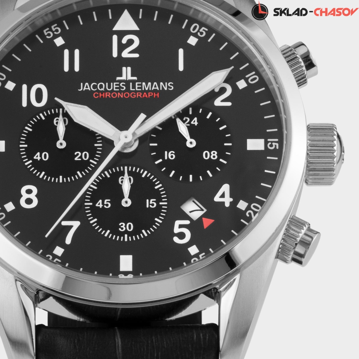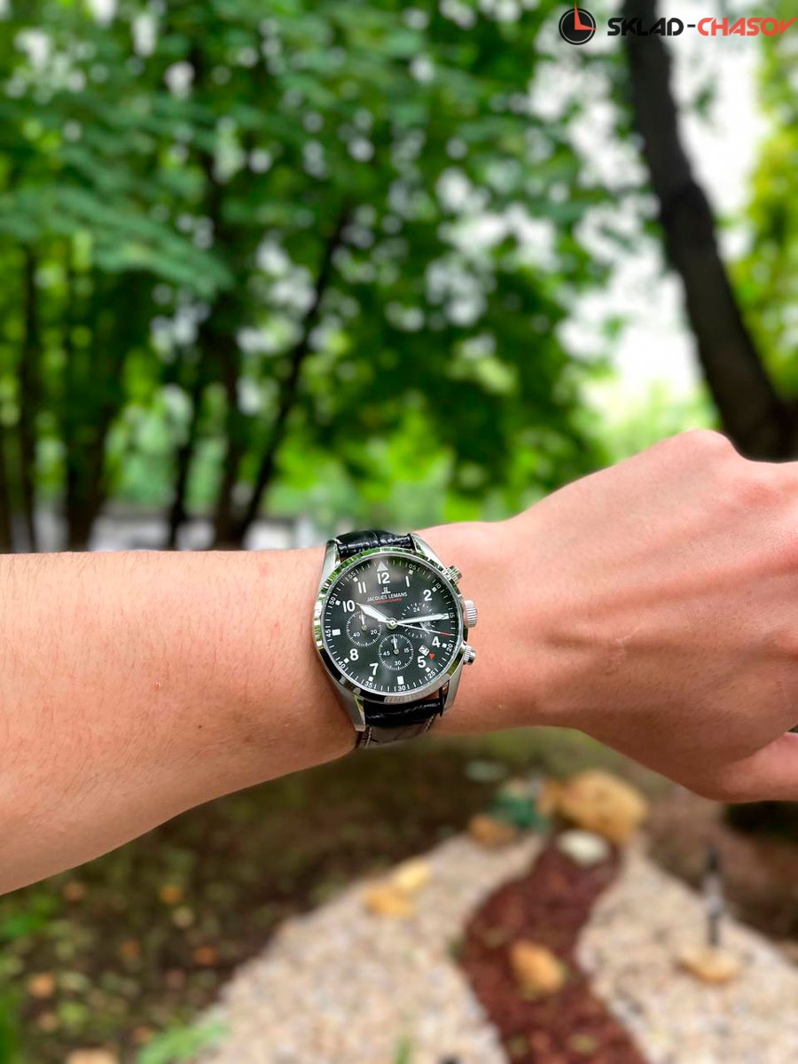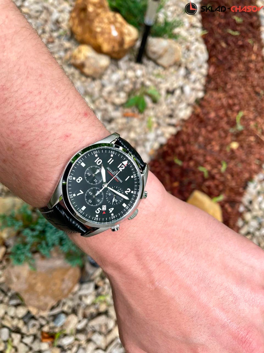 Хронограф с кварцевым механизмом и повышенной водостойкостью 10 атмосфер — это надежный и универсальный аксессуар, уместный в любом образе, независимо от времени года и влияний моды. Корпус часов сделан из нержавеющей стали. Этот материал обладает гипоаллергенными свойствами и стойкостью к коррозии. На черном циферблате хронографа нашлось место для трех дополнительных индикаторов (минутный и секундный накопитель, индикатор 24-х часов) и окошка даты. Стрелки и крупные арабские цифры покрыты люминесцентным составом, который светится в темноте. В часах установлено минеральное стекло Crystex. Ремешок черного цвета из натуральной кожи дополнен тиснением и контрастной прошивкой.