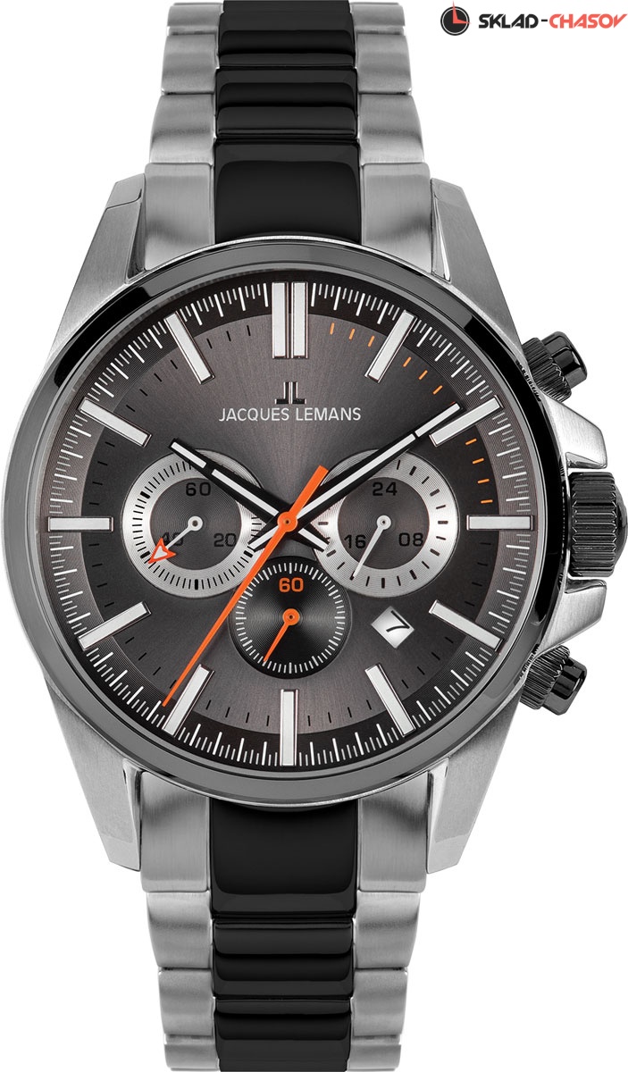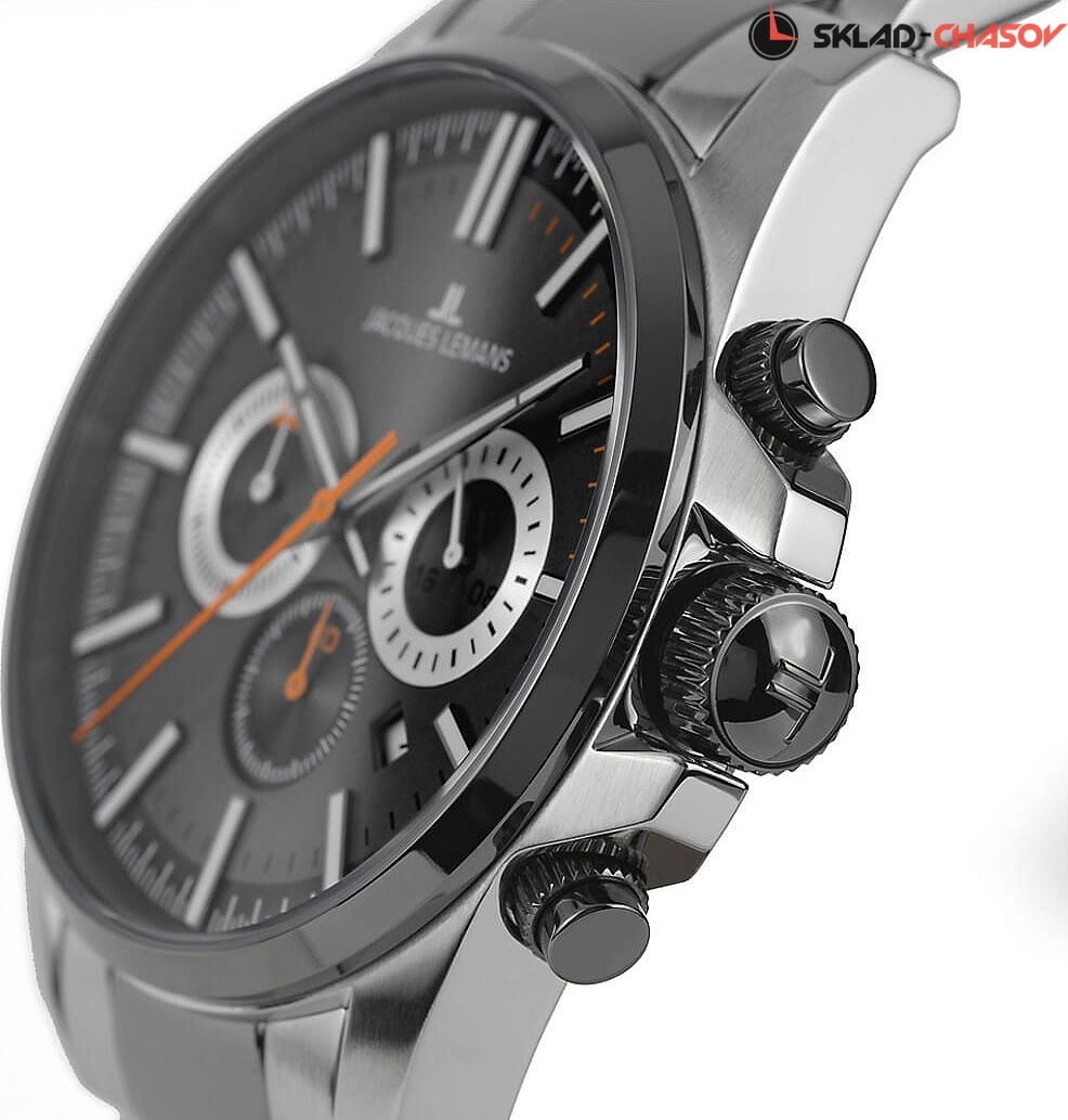 Современный спортивный хронограф от Jacques Lemans установлен в массивный корпус из гипоаллергенной нержавеющей стали.