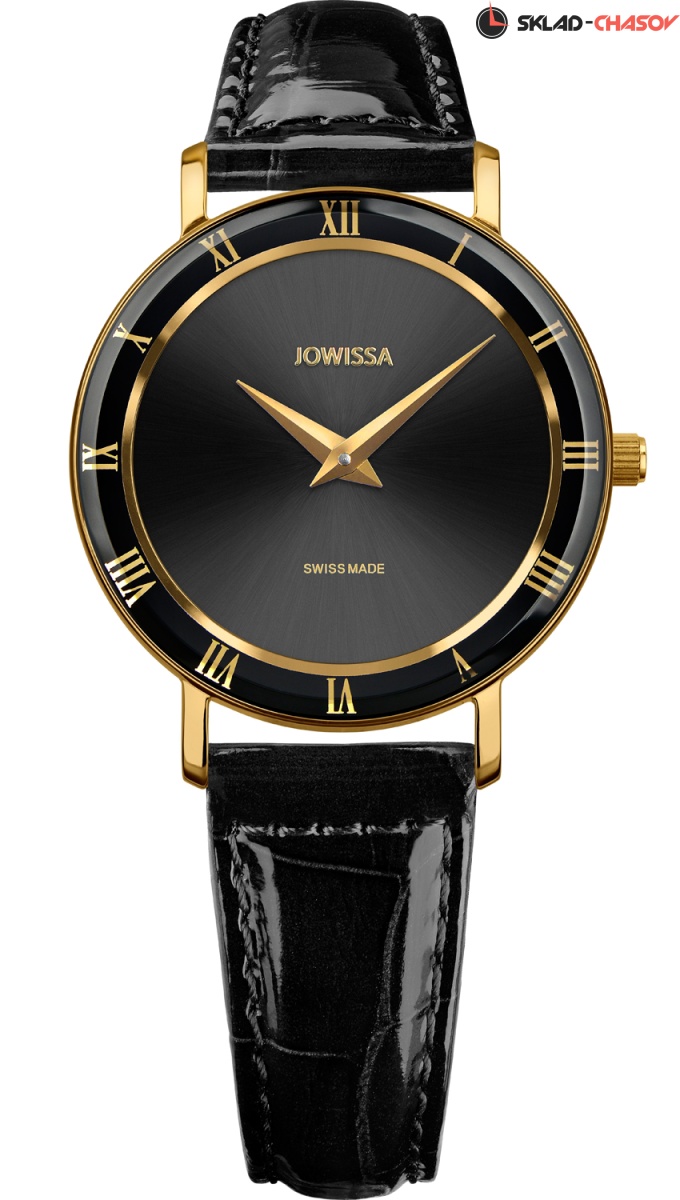 30 мм, кварц, 5 АТМ, черный циферблат, черный кожаный браслет - глянцевый, IP – желтое золото, закаленное минеральное стекло с полированной кромкой