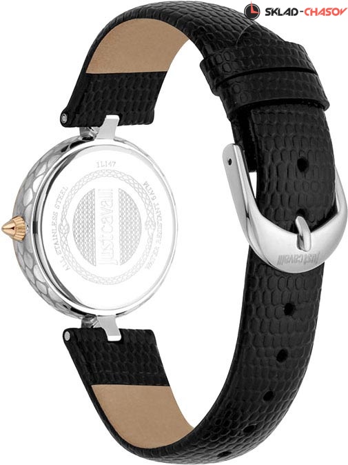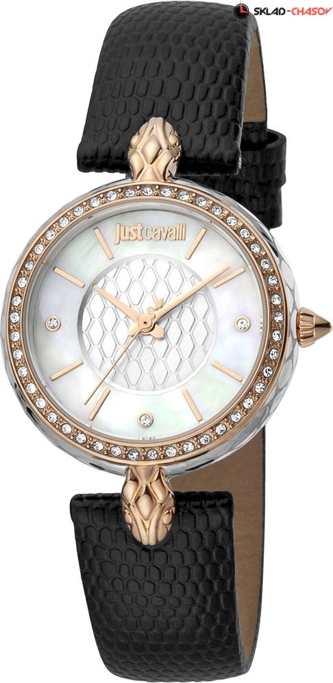 Изысканность и неповторимость стиля от известного бренда. Эти часы - идеальный и незаменимый аксессуар, дополняющий ваш образ. Восхитительные женские часы Glam Chic с круглым стальным корпусом. Корпус по бокам украшен гравировкой. Ушки крепления корпуса выполнены в виде головы змеи. Двухуровневый циферблат украшен надписью Just Cavalli. Метки на циферблате в виде штрихов и точек, украшеных кристаллами Сваровски. Заводная головка конусообразной формы. Кожаный ремешок с классической застежкой.