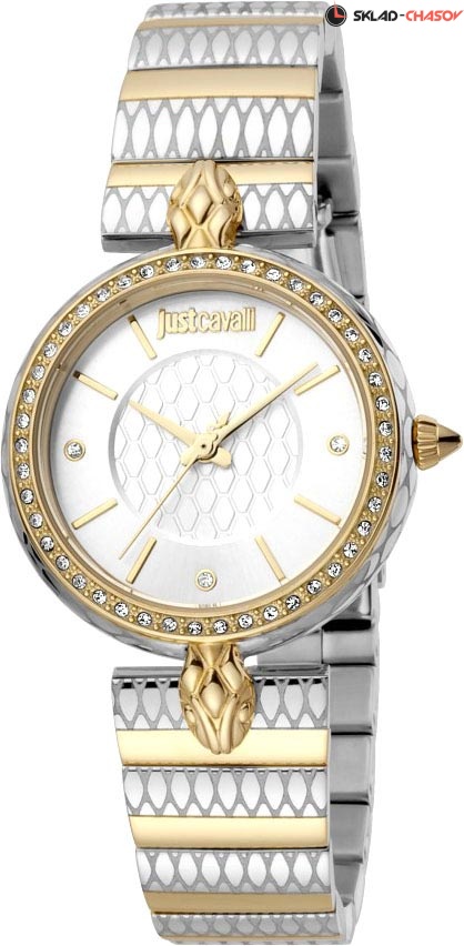 Изысканность и неповторимость стиля от известного бренда. Эти часы - идеальный и незаменимый аксессуар, дополняющий ваш образ. Восхитительные женские часы Glam Chic с круглым стальным корпусом. Корпус по бокам украшен гравировкой. Ушки крепления корпуса выполнены в виде головы змеи. Двухуровневый циферблат украшен надписью Just Cavalli. Метки на циферблате в виде штрихов и точек, украшеных кристаллами Сваровски. Заводная головка конусообразной формы. Стальной браслет с раскладывающейся застежкой.