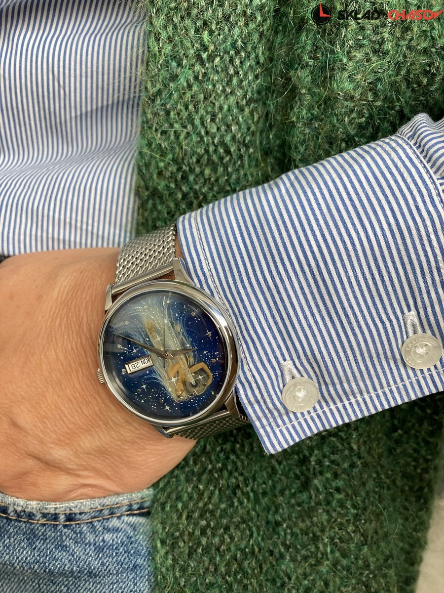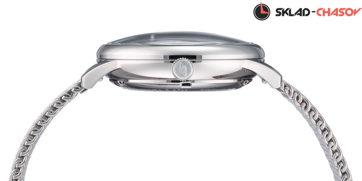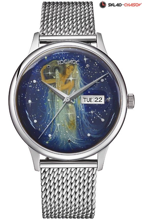 В окружении созвездий Кита, Дельфина и Эридана, в области, которую часто называют морем, находится одно из самых старых и крупных созвездий под названием Водолей. Еще древние греки связали время появления созвездия на небе с наступлением сезона дождей. Отсюда и возник символ, который мы видим на античных звездных атласах: юноша, поливающий землю водой из кувшина. На циферблате часов Космос кувшин держит на плечах хрупкая девушка, обрамленная роскошной гривой волос. Конфигурация созвездия Водолея просматривается в рисунке из ярких звезд, которые художник бренда связал тончайшей линией. Для создания модели серии Уникальные часы художники бренда выбрали технику лаковой миниатюры. На основу наносится несколько слоев лака и краски, их чередование создает эффект объема и ощущение динамики. Постепенно прорисовываются детали, добавляется серебряная или золотая фольга: на один сюжет требуется до 50 часов работы. Процесс запекания миниатюры в специальной печи придает рисунку необходимый блеск и завершенность. Часы созданы в единственном экземпляре. В часах установлен механизм TMI с функцией автоподзавода. Кроме часов, минут и секунд здесь предусмотрены дата и день недели. Их индикатор, выделенный накладной рамкой, вы найдете в позиции «3 часа». За движением деталей механизма можно наблюдать, стоит только перевернуть часы: задняя крышка прозрачна. Часовая и минутная стрелка покрыты люминесцентным составом, который светится в темноте. Минеральное стекло сделано по технологии, характерной для 60-70-х годов прошлого века: оно выпуклое с обеих сторон. Нити из нержавеющей стали в браслете складываются в особое плетение, названное «миланским». Оно придает браслету гибкости, сохраняя прочность. Специальная застежка позволяет легко регулировать длину браслета самостоятельно.