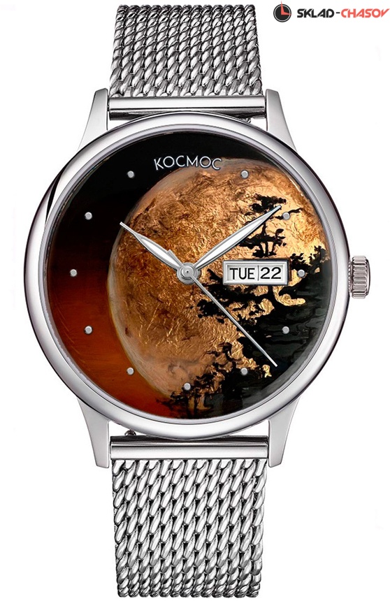 Суперлунием называют момент, когда полная Луна подходит к Земле на расстояние ближе 362 тысяч километров. Диск при этом светится ярче на треть, диаметр спутника выглядит больше на 15%. Это, несомненно, эффектное астрономическое явление отражено в сюжете лаковой миниатюры на циферблате часов Космос. На основу наносится тончайший лист фольги, следом - несколько слоев лака и краски. Их чередование создает эффект объема и ощущение динамики. Постепенно прорисовываются детали: на один сюжет требуется до 50 часов работы. Процесс запекания миниатюры в специальной печи придает рисунку необходимый блеск и завершенность. Часы созданы в единственном экземпляре. В часах установлен механизм TMI с функцией автоподзавода. Кроме часов, минут и секунд здесь предусмотрены дата и день недели. Их индикатор, выделенный накладной рамкой, вы найдете в позиции «3 часа». За движением деталей механизма можно наблюдать, стоит только перевернуть часы: задняя крышка прозрачна. Часовая и минутная стрелка покрыты люминесцентным составом, который светится в темноте. Минеральное стекло сделано по технологии, характерной для 60-70-х годов прошлого века: оно выпуклое с обеих сторон. Нити из нержавеющей стали в браслете складываются в особое плетение, названное «миланским». Оно придает браслету гибкости, сохраняя прочность. Специальная застежка позволяет легко регулировать длину браслета самостоятельно.