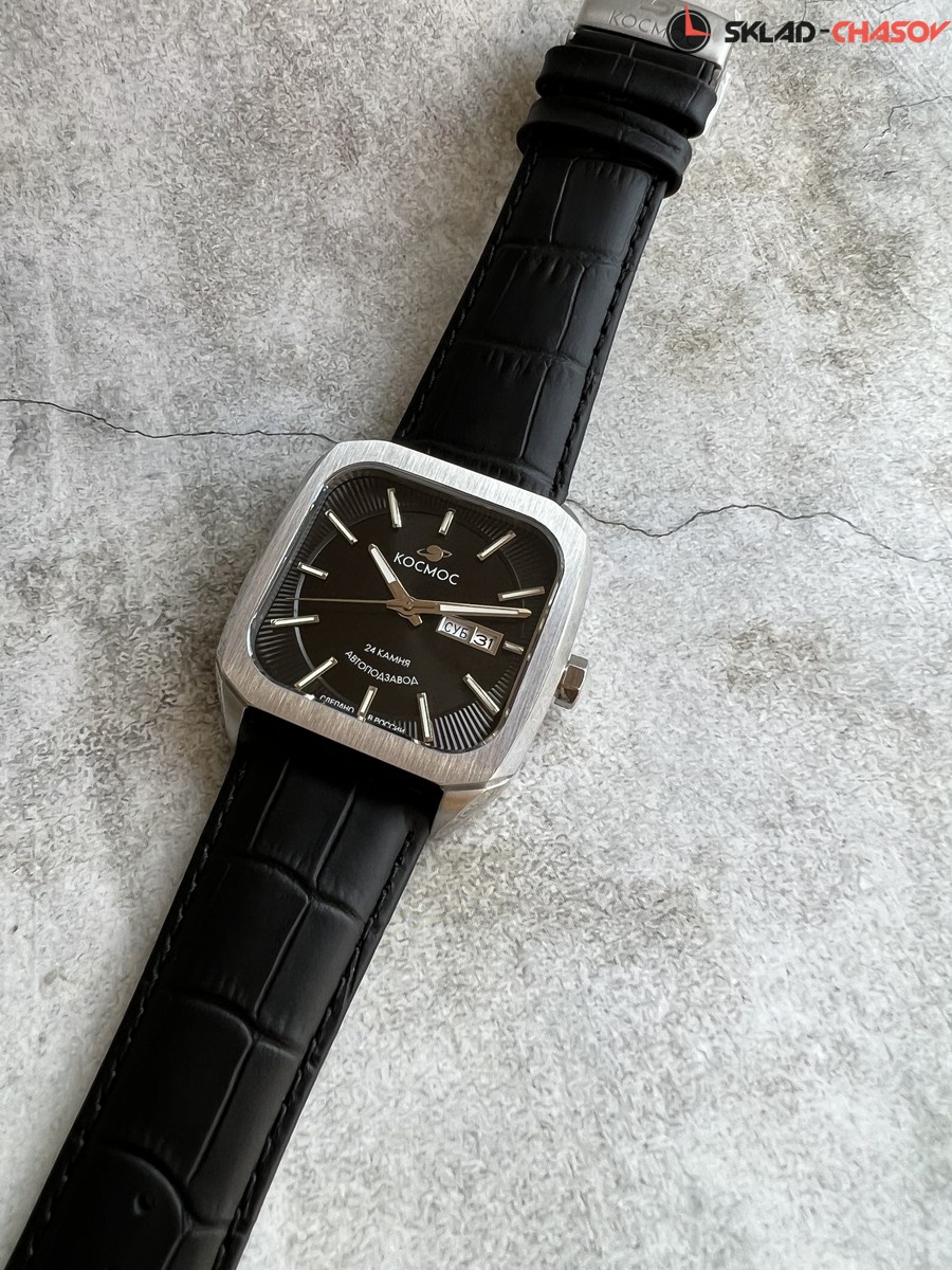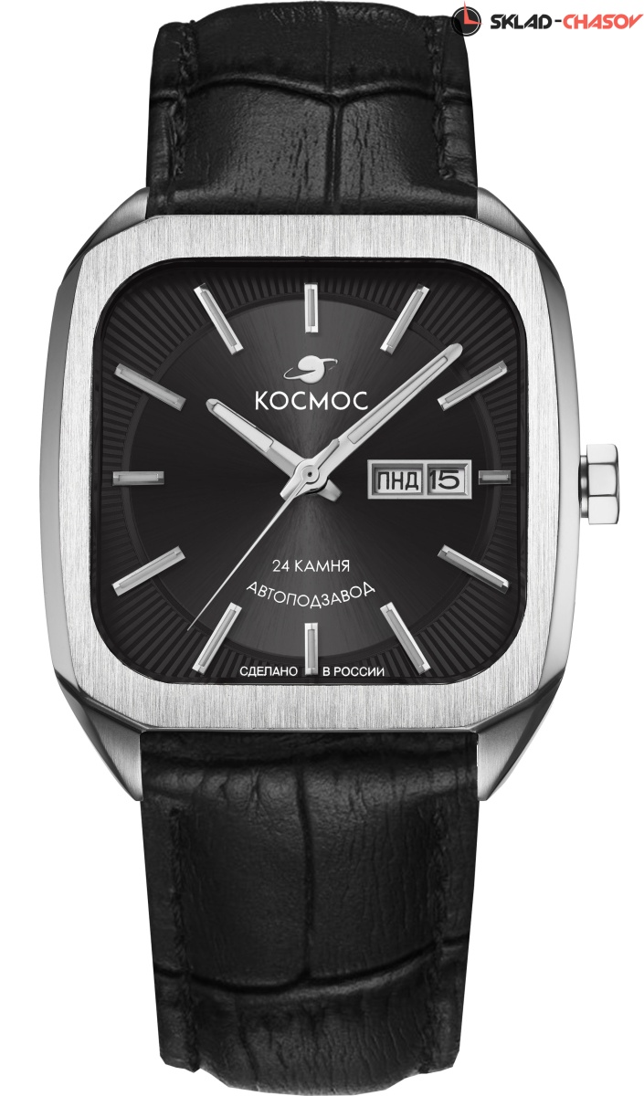Корпус часов в форме квадрата с закругленными углами сделан из нержавеющей стали, украшенной зеркальной полировкой и сатинированием. Удобная заводная головка имеет форму гайки. Задняя крышка прозрачная, что традиционно для механических часов. Сквозь это специальное окошко можно увидеть работу механизма TMI. Его подвижный ротор не только позволяет заводить пружину механизма от обычных движений руки, но и несет важную информацию: на нем вы увидите надпись «Сделано в России». Украшением служит гравировка, изображающая космонавта. Задняя крышка крепится на четырех винтах, что обеспечивает повышенную водостойкость в 10 атмосфер (100 метров). Цифры в формате от 01/50 до 50/50 обозначают индивидуальный номер модели. Ушки корпуса имеют эргономичную форму — это позволяет часам комфортно лежать на запястье. Объемный циферблат черного цвета состоит из двух уровней. В центре первого движутся три стрелки, часовая и минутная - с люминесцентным покрытием. Второй уровень декорирован гильоше в виде солнечных лучей. Индексы накладные, как и стальная рамка, выделяющая сдвоенное окошко даты и дня недели. Обратите внимание, что для индикации дня недели используется два языка: русский и английский. Сапфировое стекло с антибликовым покрытием обеспечивает защиту циферблата и хорошую читаемость показаний, независимо от условий видимости.