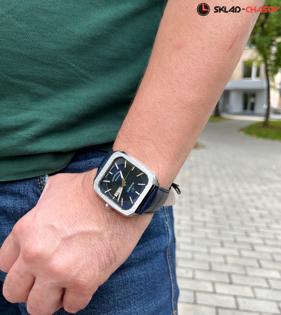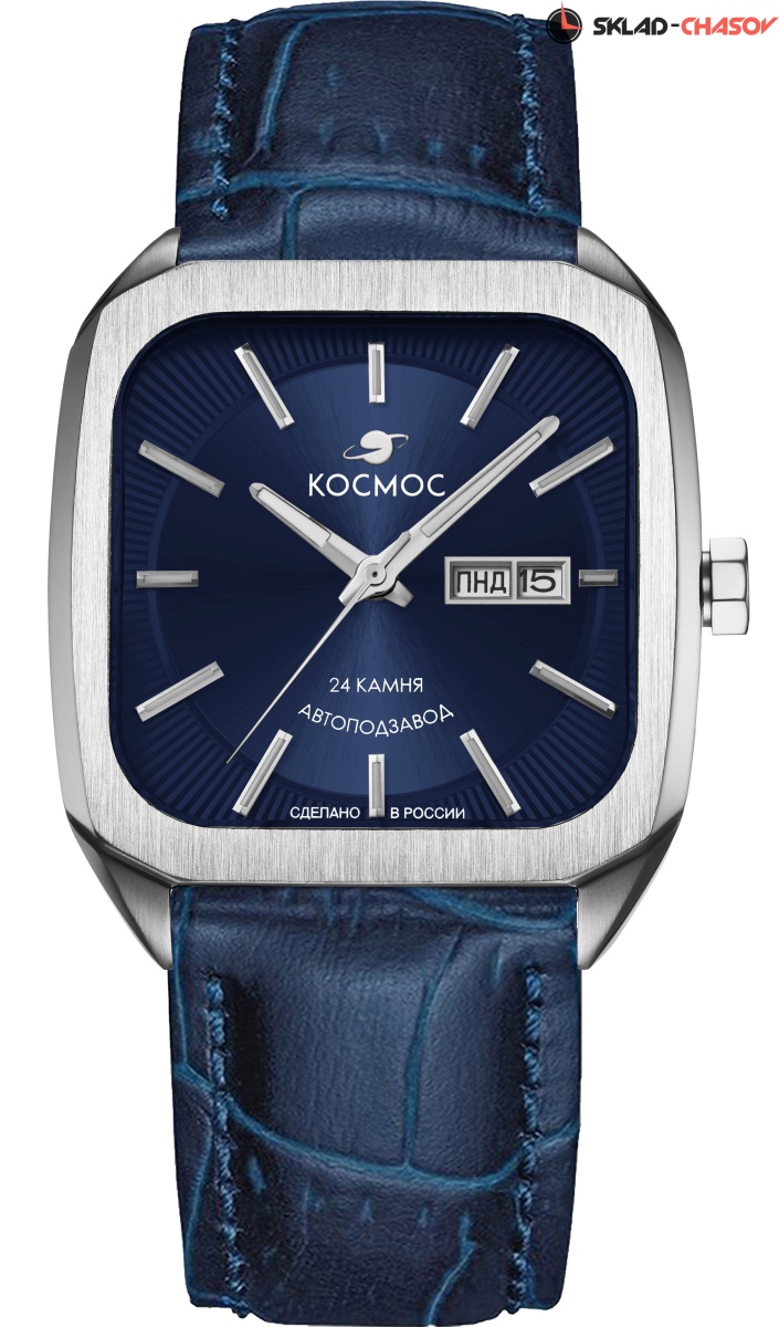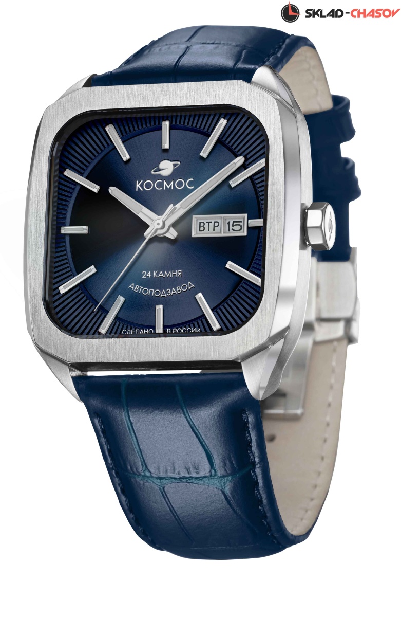 Корпус часов в форме квадрата с закругленными углами сделан из нержавеющей стали, украшенной зеркальной полировкой и сатинированием. Удобная заводная головка имеет форму гайки. Задняя крышка прозрачная, что традиционно для механических часов. Сквозь это специальное окошко можно увидеть работу механизма TMI. Его подвижный ротор не только позволяет заводить пружину механизма от обычных движений руки, но и несет важную информацию: на нем вы увидите надпись «Сделано в России». Украшением служит гравировка, изображающая космонавта. Задняя крышка крепится на четырех винтах, что обеспечивает повышенную водостойкость в 10 атмосфер (100 метров). Цифры в формате от 01/50 до 50/50 обозначают индивидуальный номер модели. Ушки корпуса имеют эргономичную форму — это позволяет часам комфортно лежать на запястье. Объемный циферблат черного цвета состоит из двух уровней. В центре первого движутся три стрелки, часовая и минутная - с люминесцентным покрытием. Второй уровень декорирован гильоше в виде солнечных лучей. Индексы накладные, как и стальная рамка, выделяющая сдвоенное окошко даты и дня недели. Обратите внимание, что для индикации дня недели используется два языка: русский и английский. Сапфировое стекло с антибликовым покрытием обеспечивает защиту циферблата и хорошую читаемость показаний, независимо от условий видимости.