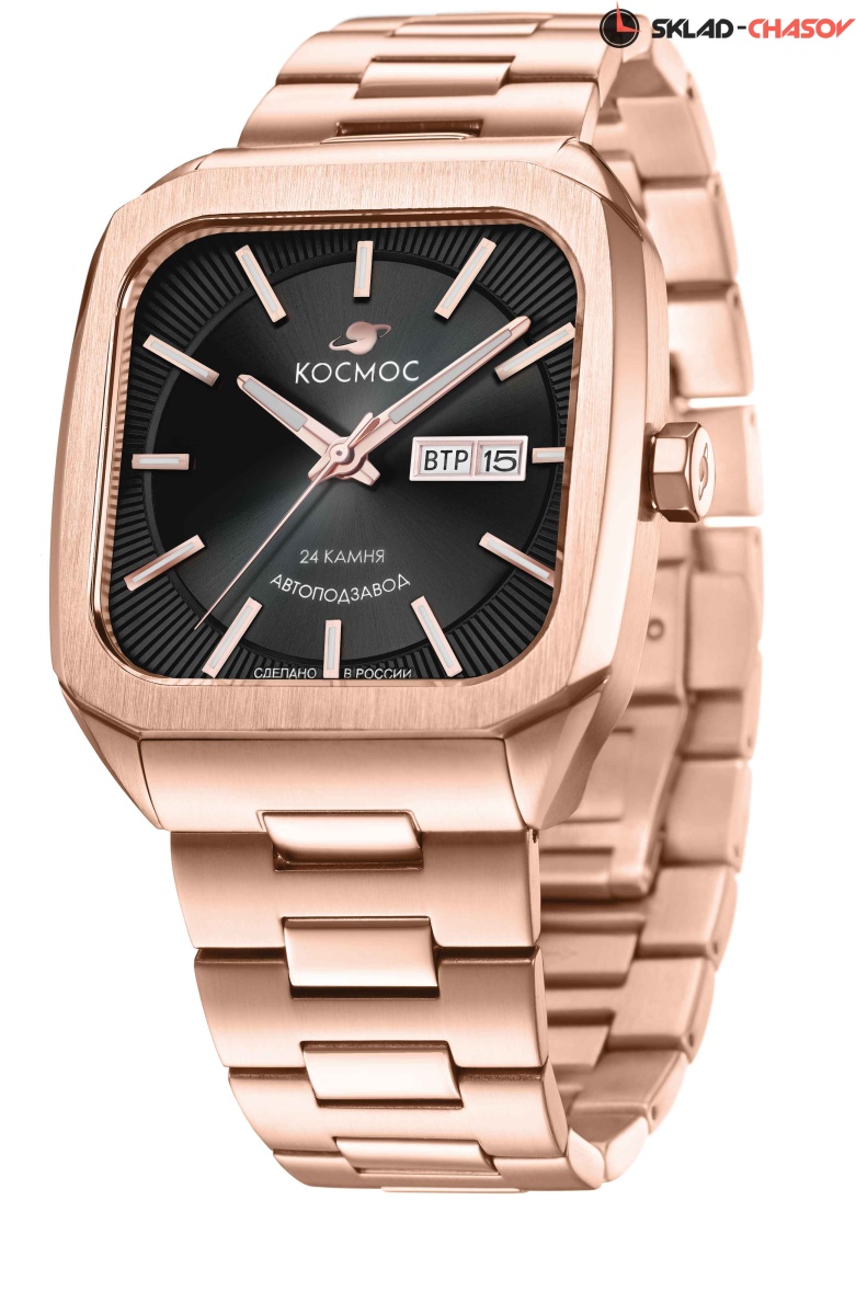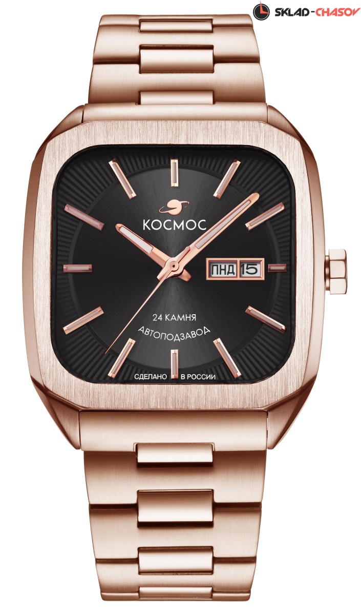 Корпус часов в форме квадрата с закругленными углами сделан из нержавеющей стали, украшенной зеркальной полировкой и сатинированием. Удобная заводная головка имеет форму гайки. Задняя крышка прозрачная, что традиционно для механических часов. Сквозь это специальное окошко можно увидеть работу механизма TMI. Его подвижный ротор не только позволяет заводить пружину механизма от обычных движений руки, но и несет важную информацию: на нем вы увидите надпись «Сделано в России». Украшением служит гравировка, изображающая космонавта. Задняя крышка крепится на четырех винтах, что обеспечивает повышенную водостойкость в 10 атмосфер (100 метров). Цифры в формате от 01/50 до 50/50 обозначают индивидуальный номер модели. Ушки корпуса имеют эргономичную форму — это позволяет часам комфортно лежать на запястье. Объемный циферблат черного цвета состоит из двух уровней. В центре первого движутся три стрелки, часовая и минутная - с люминесцентным покрытием. Второй уровень декорирован гильоше в виде солнечных лучей. Индексы накладные, как и стальная рамка, выделяющая сдвоенное окошко даты и дня недели. Обратите внимание, что для индикации дня недели используется два языка: русский и английский. Сапфировое стекло с антибликовым покрытием обеспечивает защиту циферблата и хорошую читаемость показаний, независимо от условий видимости.