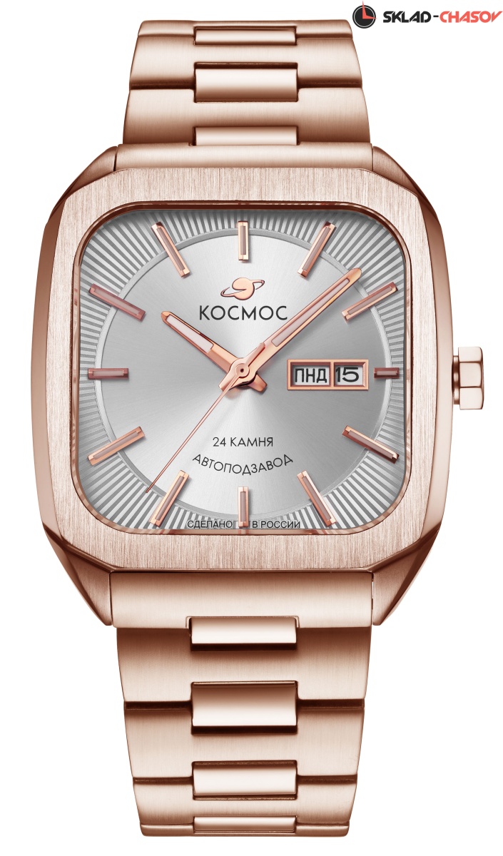 Корпус часов в форме квадрата с закругленными углами сделан из нержавеющей стали, украшенной зеркальной полировкой и сатинированием. Удобная заводная головка имеет форму гайки. Задняя крышка прозрачная, что традиционно для механических часов. Сквозь это специальное окошко можно увидеть работу механизма TMI. Его подвижный ротор не только позволяет заводить пружину механизма от обычных движений руки, но и несет важную информацию: на нем вы увидите надпись «Сделано в России». Украшением служит гравировка, изображающая космонавта. Задняя крышка крепится на четырех винтах, что обеспечивает повышенную водостойкость в 10 атмосфер (100 метров). Цифры в формате от 01/50 до 50/50 обозначают индивидуальный номер модели. Ушки корпуса имеют эргономичную форму — это позволяет часам комфортно лежать на запястье. Объемный циферблат черного цвета состоит из двух уровней. В центре первого движутся три стрелки, часовая и минутная - с люминесцентным покрытием. Второй уровень декорирован гильоше в виде солнечных лучей. Индексы накладные, как и стальная рамка, выделяющая сдвоенное окошко даты и дня недели. Обратите внимание, что для индикации дня недели используется два языка: русский и английский. Сапфировое стекло с антибликовым покрытием обеспечивает защиту циферблата и хорошую читаемость показаний, независимо от условий видимости.