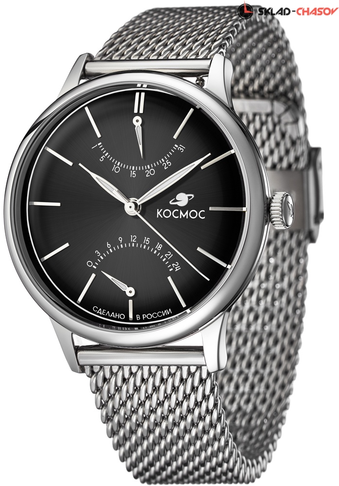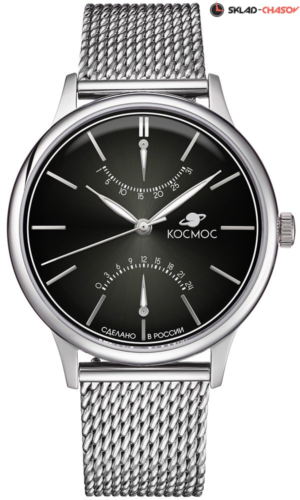 Часы Космос с кварцевым механизмом необычны по нескольким причинам. Во-первых, корпус из гипоаллергенной нержавеющей стали в профиль напоминает летательный аппарат. Этот эффект достигается благодаря выгнутым задней крышке и циферблату, а так же сферическому минеральному стеклу. Во-вторых, в окраске циферблата применили градиент: черный цвет по краям более насыщенный, чем в центре. В-третьих, индикаторы дня недели и 24 часов сделаны по принципу ретрограда: стрелка дойдя до конца отрезка, возвращается в исходное положение одним движением.