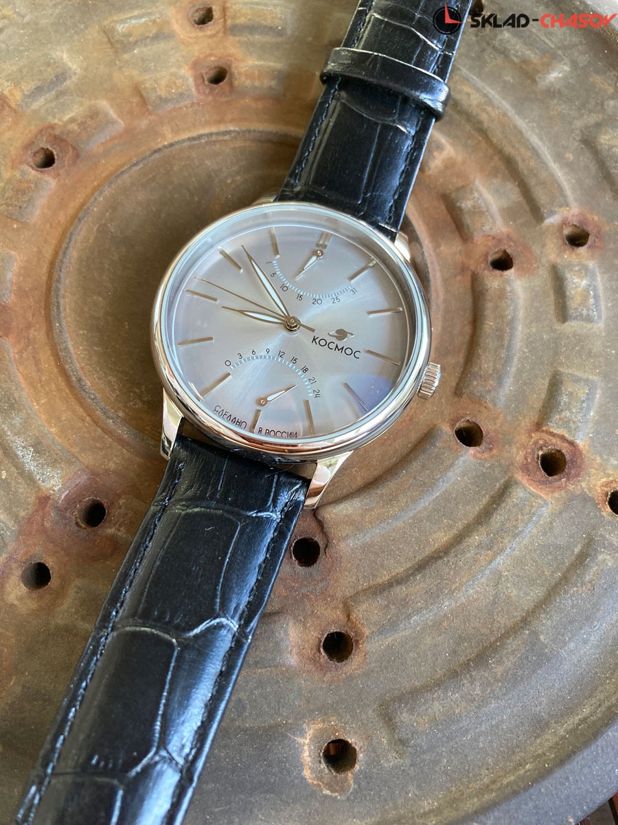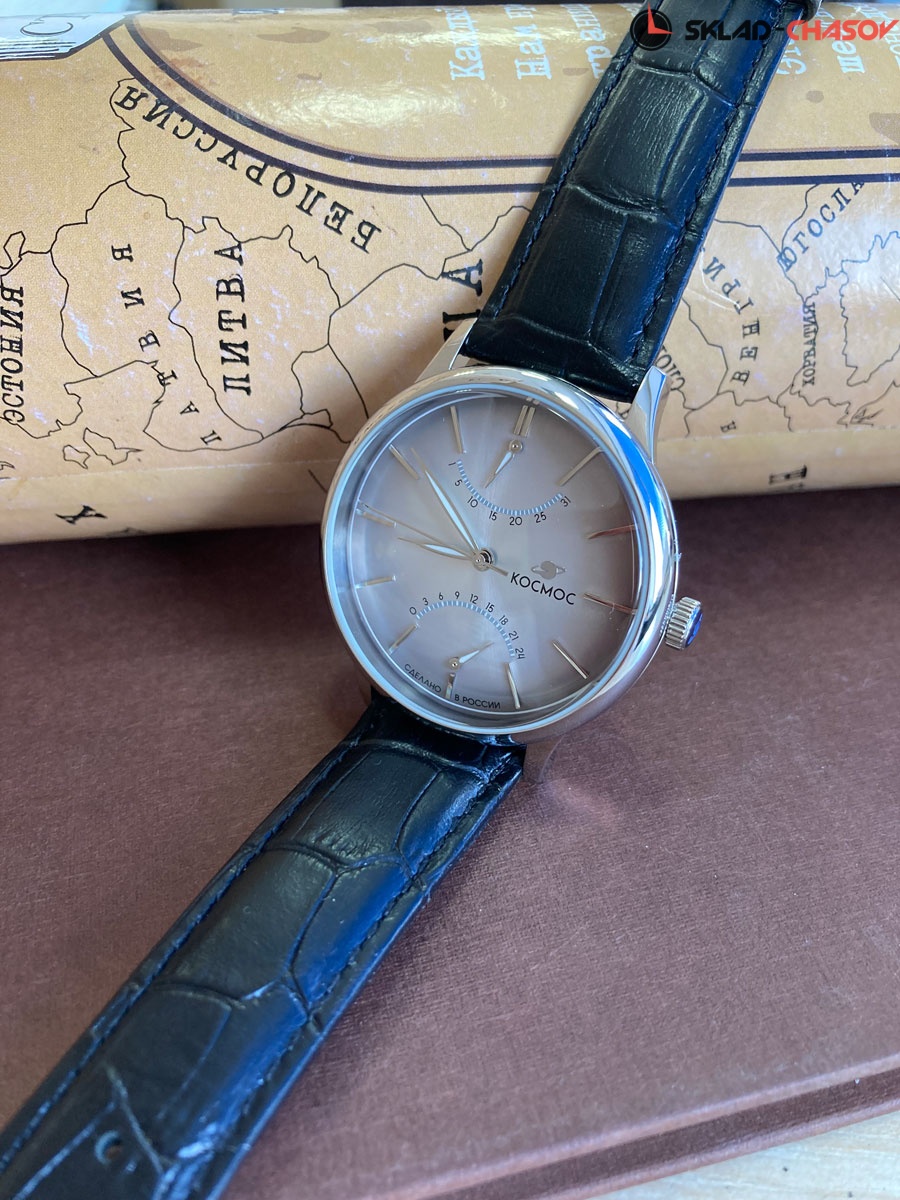 Часы Космос с кварцевым механизмом необычны по нескольким причинам. Во-первых, корпус из гипоаллергенной нержавеющей стали в профиль напоминает летательный аппарат. Этот эффект достигается благодаря выгнутым задней крышке и циферблату, а так же сферическому минеральному стеклу. Во-вторых, в окраске циферблата применили градиент: стальной цвет по краям более насыщенный, чем в центре. В-третьих, индикаторы дня недели и 24 часов сделаны по принципу ретрограда: стрелка дойдя до конца отрезка, возвращается в исходное положение одним движением.