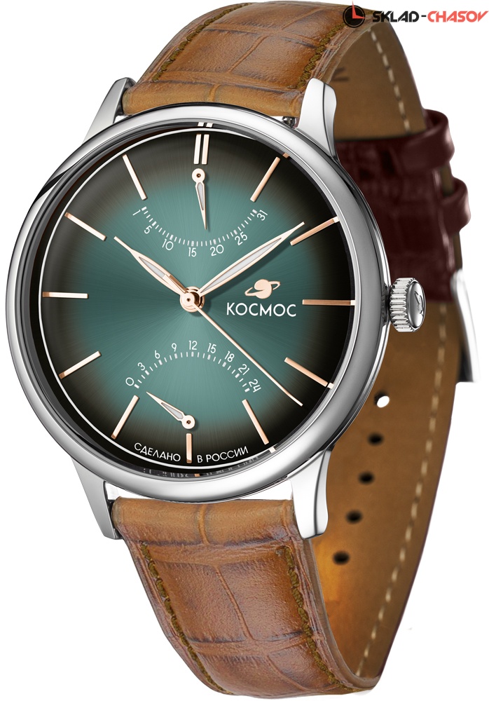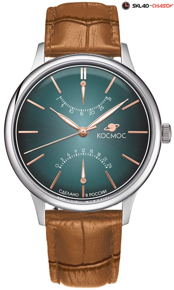 Часы Космос с кварцевым механизмом необычны по нескольким причинам. Во-первых, корпус из гипоаллергенной нержавеющей стали в профиль напоминает летательный аппарат. Этот эффект достигается благодаря выгнутым задней крышке и циферблату, а так же сферическому минеральному стеклу. Во-вторых, в окраске циферблата применили градиент: цвет морской волны по краям более насыщенный, чем в центре. В-третьих, индикаторы дня недели и 24 часов сделаны по принципу ретрограда: стрелка дойдя до конца отрезка, возвращается в исходное положение одним движением.