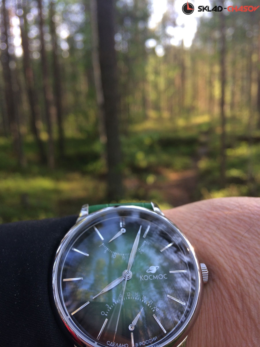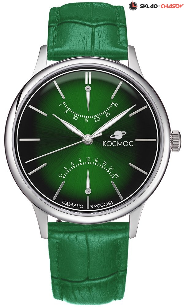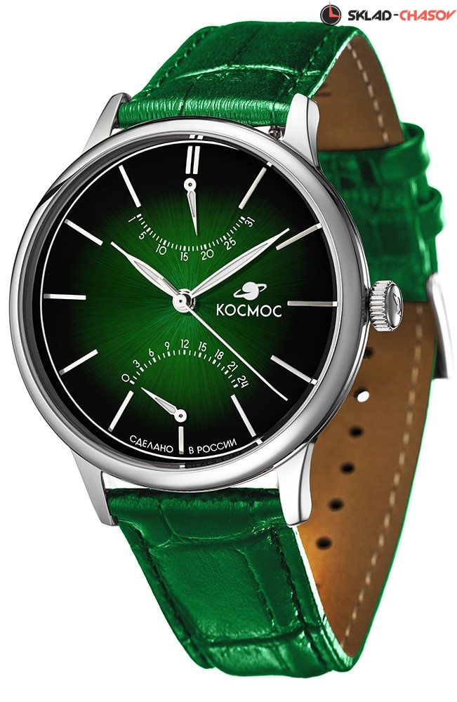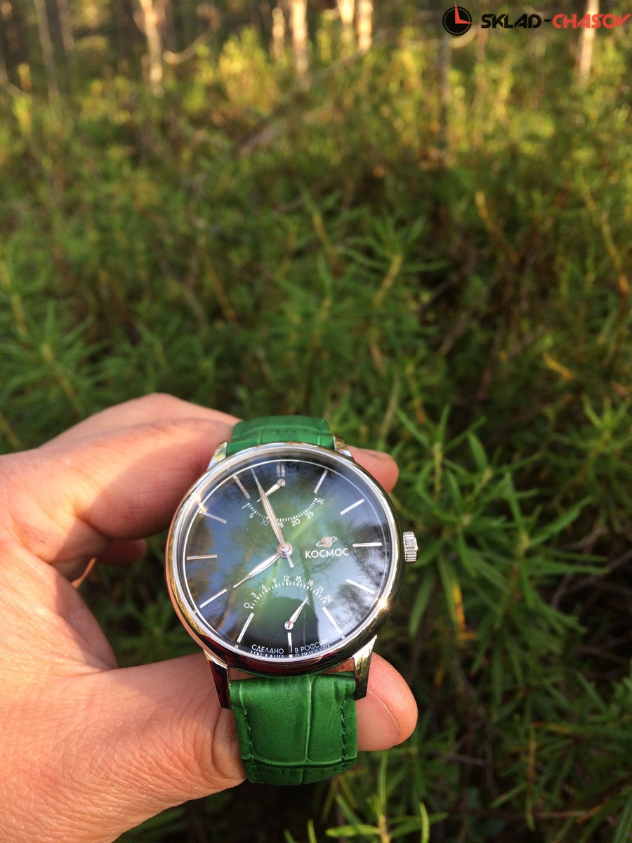 Часы Космос с кварцевым механизмом необычны по нескольким причинам. Во-первых, корпус из гипоаллергенной нержавеющей стали в профиль напоминает летательный аппарат. Этот эффект достигается благодаря выгнутым задней крышке и циферблату, а так же сферическому минеральному стеклу. Во-вторых, в окраске циферблата применили градиент: зеленый цвет по краям более насыщенный, чем в центре. В-третьих, индикаторы дня недели и 24 часов сделаны по принципу ретрограда: стрелка дойдя до конца отрезка, возвращается в исходное положение одним движением.