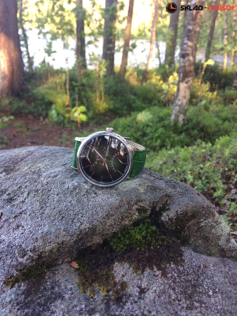 Часы установлены на ремешок зеленого цвета из натуральной кожи с прошивкой. Специальные крепежи позволяют заменить ремешок/браслет на часах самостоятельно. Больше не нужно искать универсальные варианты, вы можете приобрести сразу несколько ремней и браслетов.