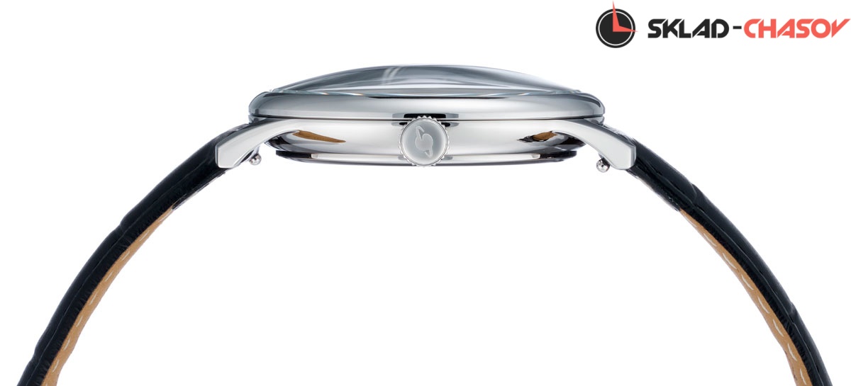 Полированный корпус часов из гипоаллергенной нержавеющей стали в профиль напоминает силуэт летающей тарелки. Секрет прост: задняя крышка, циферблат и даже минеральное стекло имеют выгнутую форму. На стальной задней крышке выгравирован сюжет - фантазия о космическом будущем человека. Заводная головка украшена логотипом бренда: стилизованным изображением планеты с орбитой космического корабля.