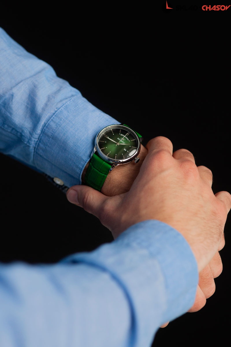 В центре широкого циферблата этой модели располагаются три стрелки: часовая, минутная и секундная. Последняя — выгнутой формы. В верхней части находится хорошо читаемый индикатор дня недели. В позиции «3 часа» - дата. Необычно смотрится эффект градиента на циферблате: зеленый цвет, насыщенный по краям, к центру светлеет.