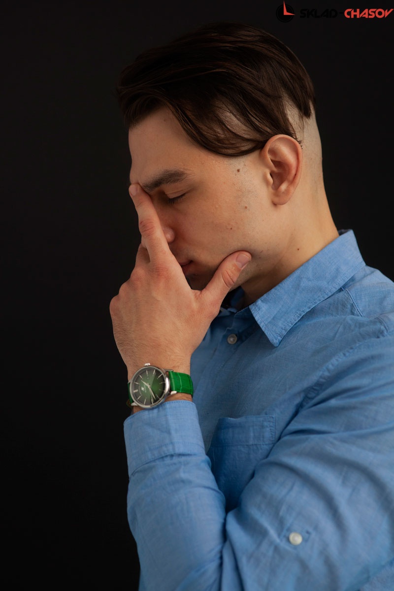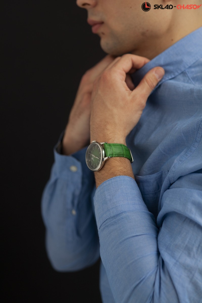 Часы установлены на ремешок зеленого цвета из натуральной кожи с прошивкой. Специальные крепежи позволяют заменить ремешок/браслет на часах самостоятельно. Больше не нужно искать универсальные варианты, вы можете приобрести сразу несколько ремней и браслетов.