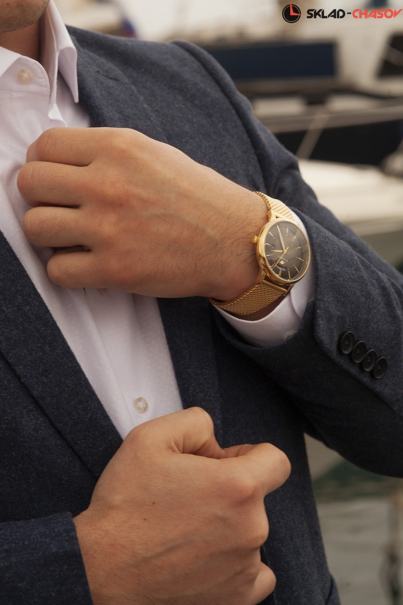 В центре широкого циферблата этой модели располагаются три стрелки: часовая, минутная и секундная. Последняя — выгнутой формы. В верхней части находится хорошо читаемый индикатор дня недели. В позиции «3 часа» - дата. Необычно смотрится эффект градиента на циферблате: черный цвет, насыщенный по краям, к центру светлеет.