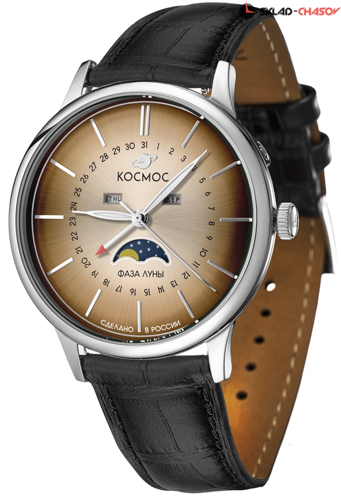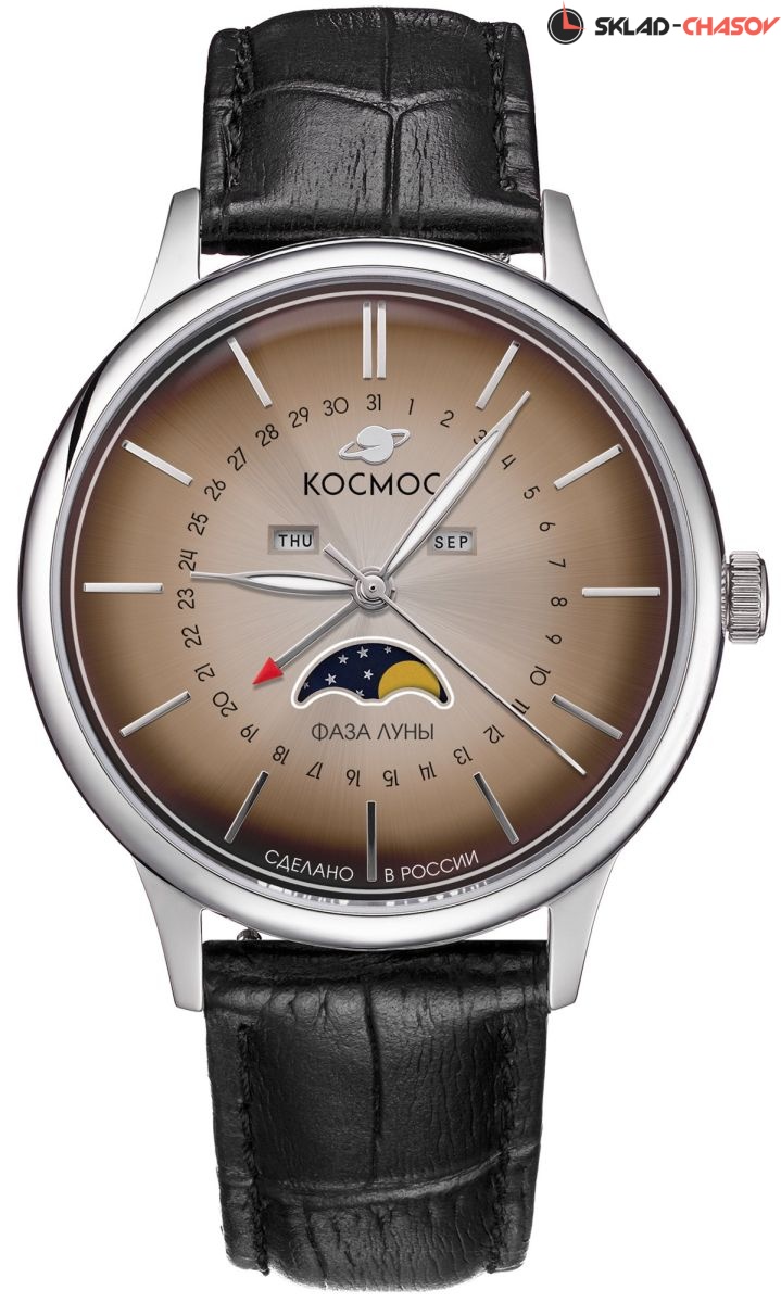 В часах Космос с кварцевым механизмом сочетаются надежность и многофункциональность. Корпус сделан из нержавеющей стали, что означает гипоаллергенность и высокую износостойкость. Его круглая форма с мягкими линиями универсальна - вы легко впишете часы в любой образ. Дополнительные индикаторы фаз луны, дня недели и месяца размещены на хорошо читаемом циферблате коричневого цвета с интересным эффектом градиента.