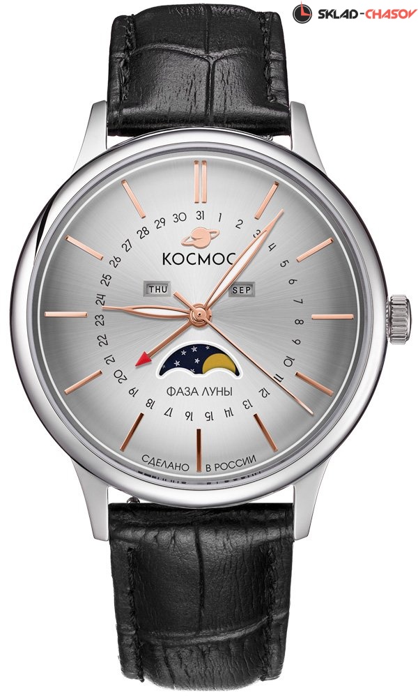 В часах Космос с кварцевым механизмом сочетаются надежность и многофункциональность. Корпус сделан из нержавеющей стали, что означает гипоаллергенность и высокую износостойкость. Его круглая форма с мягкими линиями универсальна - вы легко впишете часы в любой образ. Дополнительные индикаторы фаз луны, дня недели и месяца размещены на хорошо читаемом циферблате серого цвета с интересным эффектом градиента.