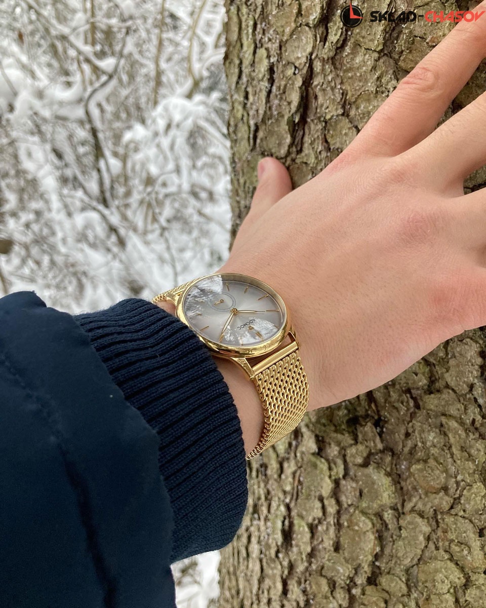 Кварцевые часы в классическом стиле помещены в корпус из гиппоаллергенной нержавеющей стали с PVD-покрытием. Его необычная форма в профиль напоминает силуэт летающей тарелки, благодаря выгнутым задней крышке и циферблату. Прочное минеральное стекло так же оригинальной сферической формы. Особую глубину циферблату серого цвета придает эффект градиента. Хорошо читаются крупные часовая и минутная стрелки. Индикация секунд вынесена в нижнюю часть циферблата.