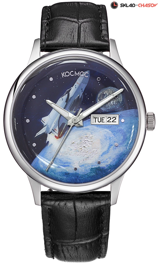 Легендарный корабль, первый и единственный, с размахом крыла около 24 метро и весом более 100 тонн два раза обогнул Землю и совершил посадку, все в автоматическом режиме. «Буран» создавали более 10 лет, а его 205 минут полета занесены в Книгу рекордов Гиннесса. Для создания модели серии Уникальные часы художники бренда выбрали технику лаковой миниатюры. На основу наносится несколько слоев лака и краски, их чередование создает эффект объема и ощущение динамики. Постепенно прорисовываются детали, добавляется тончайший лист серебряной или золотой фольги: на один сюжет требуется до 50 часов работы. Процесс запекания миниатюры в специальной печи придает рисунку необходимый блеск и завершенность. Часы созданы в единственном экземпляре. В часах установлен механизм TMI с функцией автоподзавода. Кроме часов, минут и секунд здесь предусмотрены дата и день недели. Их индикатор, выделенный накладной рамкой, вы найдете в позиции «3 часа». За движением деталей механизма можно наблюдать, стоит только перевернуть часы: задняя крышка прозрачна. Часовая и минутная стрелка покрыты люминесцентным составом, который светится в темноте. Минеральное стекло сделано по технологии, характерной для 60-70-х годов прошлого века: оно выпуклое с обеих сторон. Ремешок выполнен из натуральной кожи с прошивкой. Специальное крепление дает возможность без труда заменить ремешок на аналогичный или на стальной браслет миланского плетения.