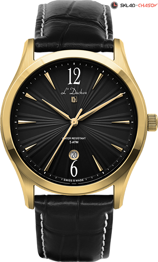 Стильные кварцевые часы в круглом корпусе элегантно смотрятся на сильной мужской руке. Надежный швейцарский механизм обеспечивает качественную и точную работу часов. Корпус выполнен из высоколегированной нержавеющей стали 316L с PVD-покрытием из желтого золота. Ушки корпуса полированы в технике вертикального матирования. Привлекает внимание черный циферблат, декорированный гильоше в виде расходящихся лучей. Указатель даты расположен на уровне шести часов и украшен стальной окантовкой. Индексы в форме пирамидок создают эффект игры света, а мечеобразные стрелки смотрятся объемными и хорошо читаемыми. Сапфировое стекло, устойчивое к царапинам, надежно защищает циферблат.