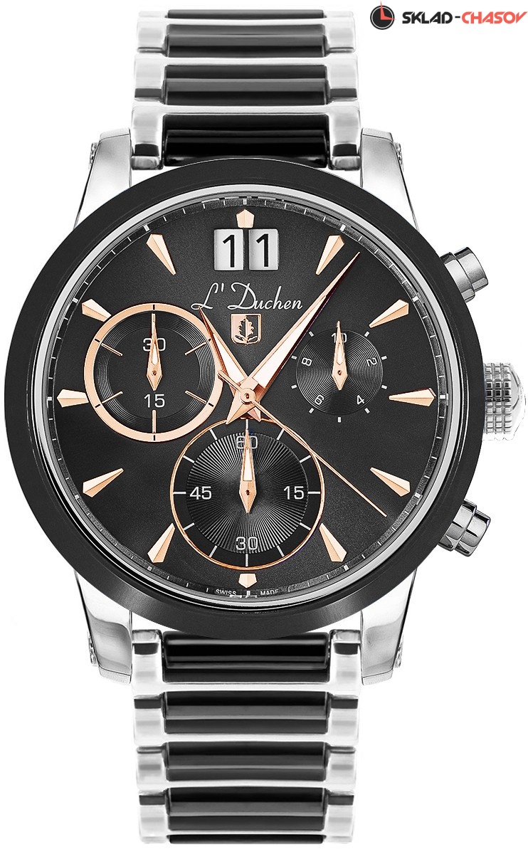 Сапфировое стекло имеет антибликовое покрытие. Заводная головка и кнопки хронографа рельефные, что делает их использование удобным и практичным. Водонепроницаемость часов – 10 атмосфер. Завинчивающаяся задняя крышка обеспечивает данный уровень защиты от воды. В часах установлен браслет из двух видов звеньев: стальных и керамических. К корпусу он крепится с помощью винтов, а на запястье его удерживает надежная и удобная в использовании застежка-бабочка с двумя боковыми кнопками. Логотип марки - «дубовый лист», который олицетворяет мудрость и долговечность - расположен на задней крышке корпуса часов и застежке.