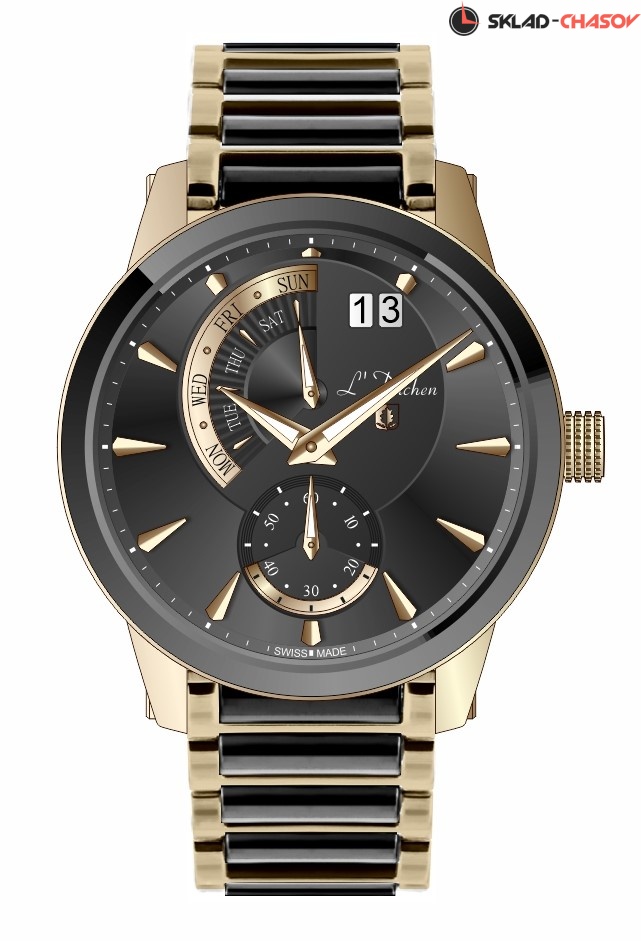В часах установлен надежный швейцарский механизм с функциями: часы, минуты, секунды, дата, день недели. Корпус часов изготовлен из гипоаллергенной нержавеющей стали 316L с PVD-покрытием из розового золота. Размер корпуса 42 мм. Безель часов выполнен из высокотехнологичной керамики синего цвета. Керамика — прочный материал, не царапается и позволяет надолго сохранить внешний вид часов. Синий циферблат смотрится глубоким и объемным, благодаря «колодцу» по внутреннему краю с нанесенной разметкой. Визуально выделены два круга контрастной обработки, которые напоминают аэростат – символ данной коллекции. По краю малого круга выполнено гильоше в виде концентрических колец. В модели представлена функция «большая дата». Механизм «большой даты» состоит из двух колес: одно показывает цифры от 0 до 10, другое – от 1 до 3. Это позволяет сделать цифры достаточно крупными и хорошо читаемыми на циферблате. В отличие от механизма обычной даты, который состоит из одного колеса, на котором расположены 31 цифра небольшого размера. Необычно смотрится ретроградный указатель дня недели. На нем стрелка движется по полукругу, стремительно возвращаясь на исходную позицию. Индикаторы дня недели и вынесенной секундной стрелки украшены металлическими пластинами. Индексы изготовлены в виде конусов. Часы смотрятся строго и респектабельно. На минутную и часовую стрелки, вынесенную секундную стрелку и день недели нанесено люминесцентное покрытие, что позволяет определять время в темноте.