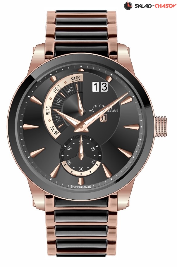 В часах установлен надежный швейцарский механизм с функциями: часы, минуты, секунды, дата, день недели. Корпус часов изготовлен из гипоаллергенной нержавеющей стали 316L с PVD-покрытием из розового золота. Размер корпуса 42 мм. Безель часов выполнен из высокотехнологичной керамики черного цвета. Керамика — прочный материал, не царапается и позволяет надолго сохранить внешний вид часов. Черный циферблат смотрится глубоким и объемным, благодаря «колодцу» по внутреннему краю с нанесенной разметкой. Визуально выделены два круга контрастной обработки, которые напоминают аэростат – символ данной коллекции. По краю малого круга выполнено гильоше в виде концентрических колец. В модели представлена функция «большая дата». Механизм «большой даты» состоит из двух колес: одно показывает цифры от 0 до 10, другое – от 1 до 3. Это позволяет сделать цифры достаточно крупными и хорошо читаемыми на циферблате. В отличие от механизма обычной даты, который состоит из одного колеса, на котором расположены 31 цифра небольшого размера. Необычно смотрится ретроградный указатель дня недели. На нем стрелка движется по полукругу, стремительно возвращаясь на исходную позицию. Индикаторы дня недели и вынесенной секундной стрелки украшены металлическими пластинами. Индексы изготовлены в виде конусов. Часы смотрятся строго и респектабельно. На минутную и часовую стрелки, вынесенную секундную стрелку и день недели нанесено люминесцентное покрытие, что позволяет определять время в темноте.