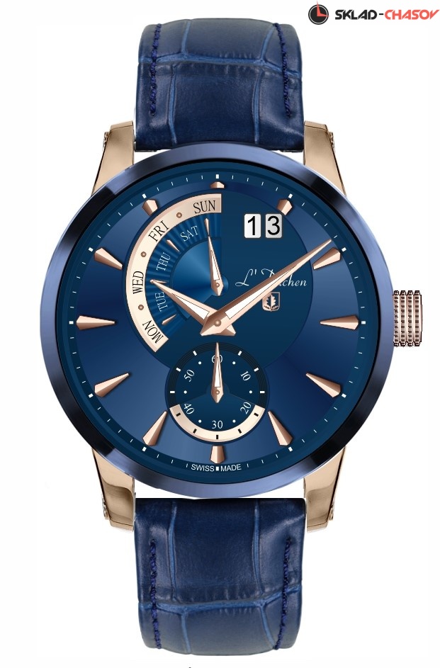 В часах установлен надежный швейцарский механизм с функциями: часы, минуты, секунды, дата, день недели. Корпус часов изготовлен из гипоаллергенной нержавеющей стали 316L с PVD-покрытием из розового золота. Размер корпуса 42 мм. Безель часов выполнен из высокотехнологичной керамики синего цвета. Керамика — прочный материал, не царапается и позволяет надолго сохранить внешний вид часов. Синий циферблат смотрится глубоким и объемным, благодаря «колодцу» по внутреннему краю с нанесенной разметкой. Визуально выделены два круга контрастной обработки, которые напоминают аэростат – символ данной коллекции. По краю малого круга выполнено гильоше в виде концентрических колец. В модели представлена функция «большая дата». Механизм «большой даты» состоит из двух колес: одно показывает цифры от 0 до 10, другое – от 1 до 3. Это позволяет сделать цифры достаточно крупными и хорошо читаемыми на циферблате. В отличие от механизма обычной даты, который состоит из одного колеса, на котором расположены 31 цифра небольшого размера. Необычно смотрится ретроградный указатель дня недели. На нем стрелка движется по полукругу, стремительно возвращаясь на исходную позицию. Индикаторы дня недели и вынесенной секундной стрелки украшены металлическими пластинами. Индексы изготовлены в виде конусов. Часы смотрятся строго и респектабельно. На минутную и часовую стрелки, вынесенную секундную стрелку и день недели нанесено люминесцентное покрытие, что позволяет определять время в темноте.