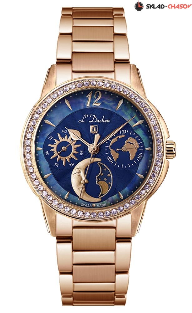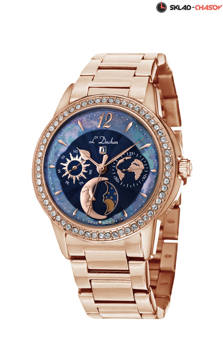 Кварцевый швейцарский механизм надежно скрыт в стальном корпусе круглой формы. Привлекает внимание сочетание матированных и полированных элементов на корпусе. Широкий полированный безель с фианитами интересно играет на свету. Почти невидимое, но стойкое к появлению царапин, сапфировое стекло позволяет любоваться главной изюминкой модели — роскошным циферблатом синего цвета. Центральная часть циферблата декорирована волнообразным гильоше. Индикатор дней недели представлен в виде солнечного диска, индикатор даты украшает изображение карты нашей планеты. Указатель лунных фаз элегантно выделен металлической рамкой и дополнен объемным элементом в виде месяца. И, конечно, неповторимость и уникальность часам придает кольцо из натурального перламутра по краю циферблата. Часы установлены на браслете из нержавеющей стали с PVD-покрытием из розового золота, дополненном раскладной застежкой - «бабочкой» с логотипом бренда. День недели и месяц устанавливаются с помощью скрытой кнопки, которая находится сбоку на корпусе. Разработчики предусмотрительно расположили ее таким образом, чтобы механизм часов не был поврежден в результате частого и некорректного использования кнопки. Водостойкость часов 5 атмосфер. Завинчивающаяся задняя крышка обеспечивает данный уровень защиты от воды.