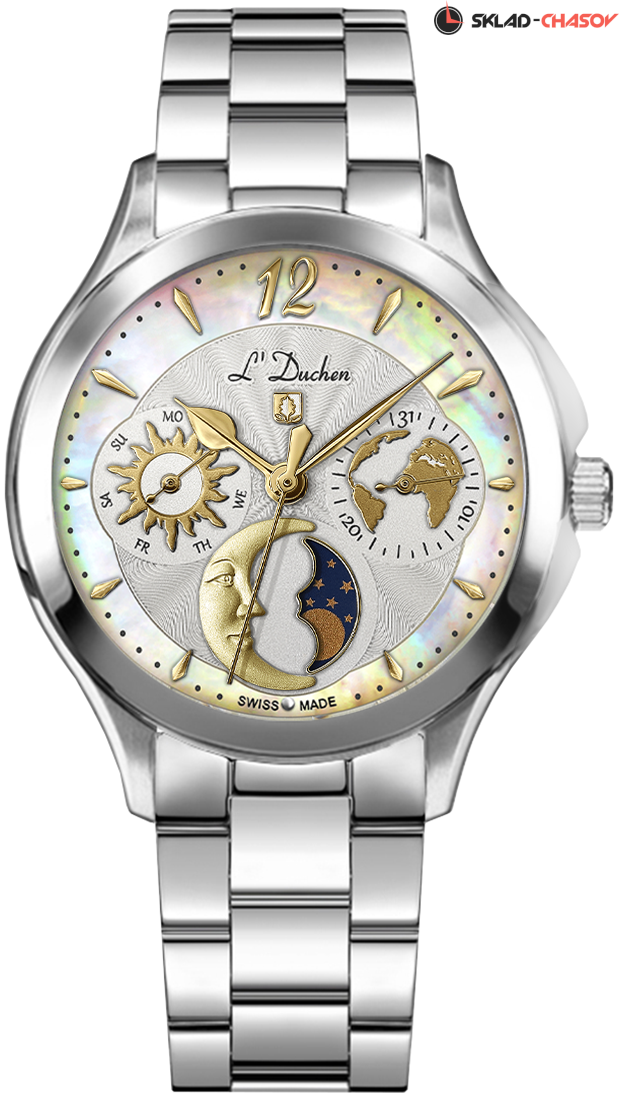 Кварцевый швейцарский механизм надежно скрыт в стальном 34-миллиметровом корпусе круглой формы. Привлекает внимание сочетание матированных и полированных элементов на корпусе. Широкий полированный безель интересно играет на свету. Почти невидимое, но стойкое к появлению царапин, сапфировое стекло позволяет любоваться главной изюминкой модели — роскошным белым циферблатом. Центральная часть циферблата декорирована волнообразным гильоше. Индикатор дней недели представлен в виде солнечного диска, индикатор даты украшает изображение карты нашей планеты. Указатель лунных фаз элегантно выделен металлической рамкой и дополнен объемным элементом в виде месяца. И, конечно, неповторимость и уникальность часам придает кольцо из натурального перламутра по краю циферблата. Часы установлены на браслет из нержавеющей стали со стальной раскладной застежкой «бабочка», украшенной логотипом бренда. День недели и месяц устанавливаются с помощью скрытой кнопки, которая находится сбоку на корпусе. Разработчики предусмотрительно расположили ее таким образом, чтобы механизм часов не был поврежден в результате случайного и некорректного использования кнопки.