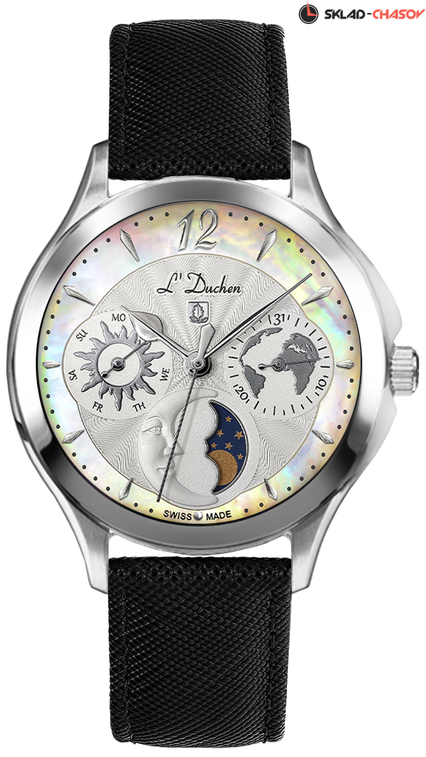 Женские часы Petit Celeste с круглым стальным корпусом. Гильошированный циферблат с перламутровой вставкой украшен фирменным логотипом L'Duchen в виде дубового листа – символа мудрости и долговечности. Метки в виде штрихов и арабской цифры 12. Число и день недели вынесены на отдельные циферблаты. Указатель фаз Луны находится в положении 6 часов. Рифленая заводная головка с защитой. Кожаный ремешок с раскладывающейся застежкой.
